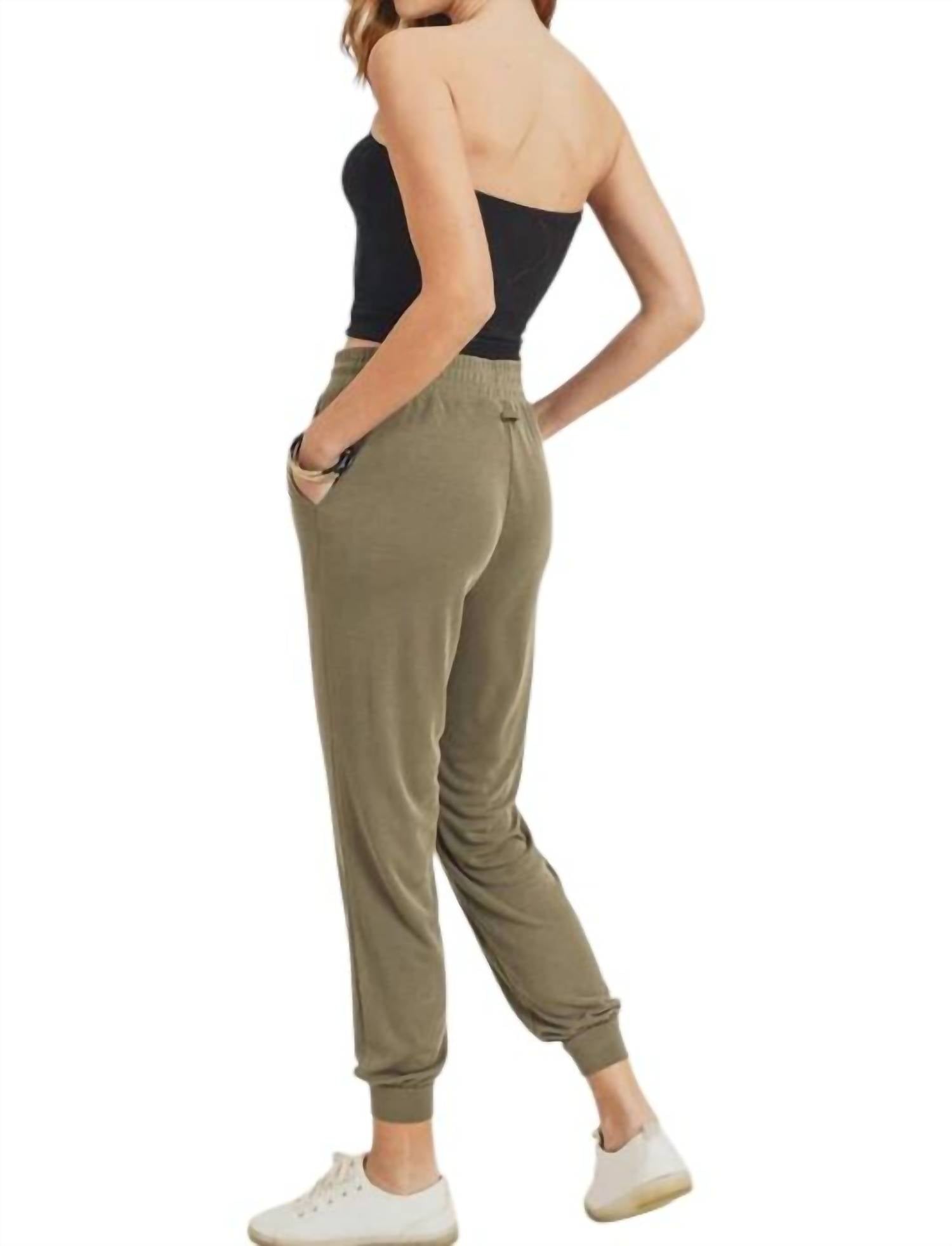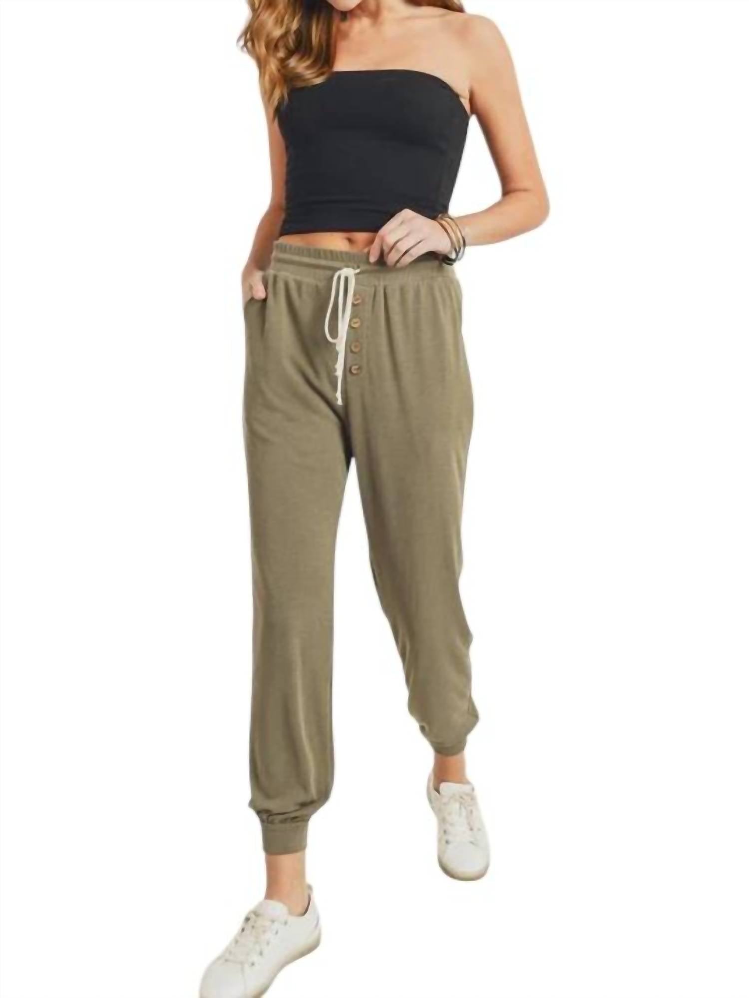 These soft knit joggers feature slant side pockets, a faux button front, and a tie waist with a pull-on style. Made from 68% modal and 32% polyester. The length is 39" and the front rise is 13".