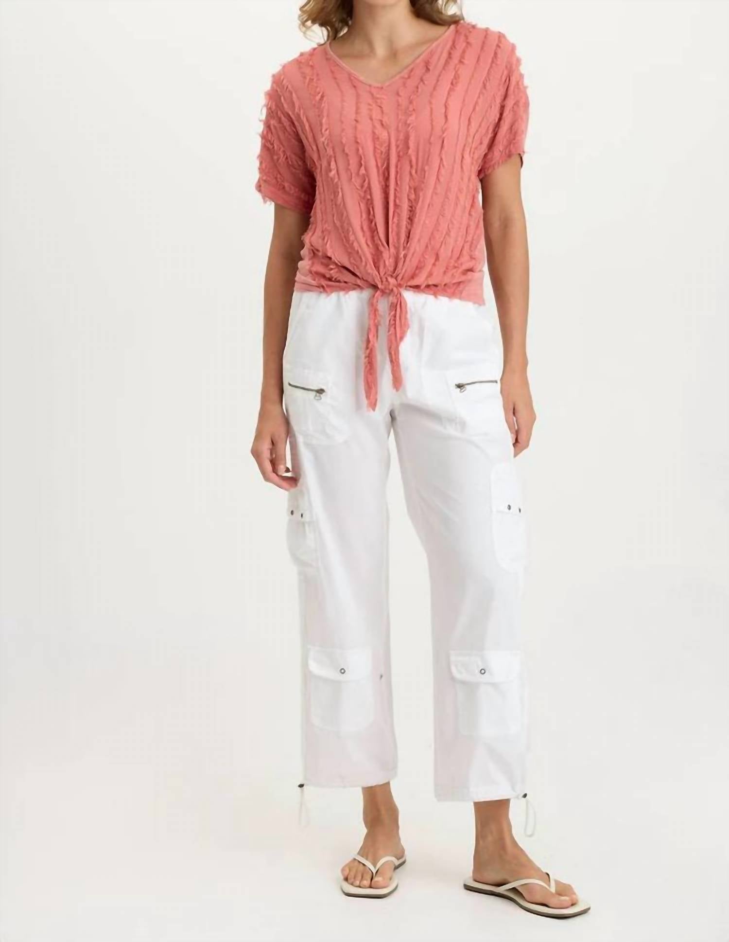 Meet the XCVI Langley Cargo Pant in crisp bright white, your go-to for effortless streetwear style this spring. Crafted from 97% Cotton 3% Spandex, these wide-leg, high-rise pants feature a relaxed fit and boast a remarkable ten pockets for ultimate travel convenience. Equipped with a rib and drawstring waistband, they allow a customizable fit and feature a cinchable leg opening. These preshrunk pants are machine washable, designed to maintain their look and feel with every wear. Inseam measures approximately 27 inches, front rise at 10.75 inches, and back rise at 16.75 inches.