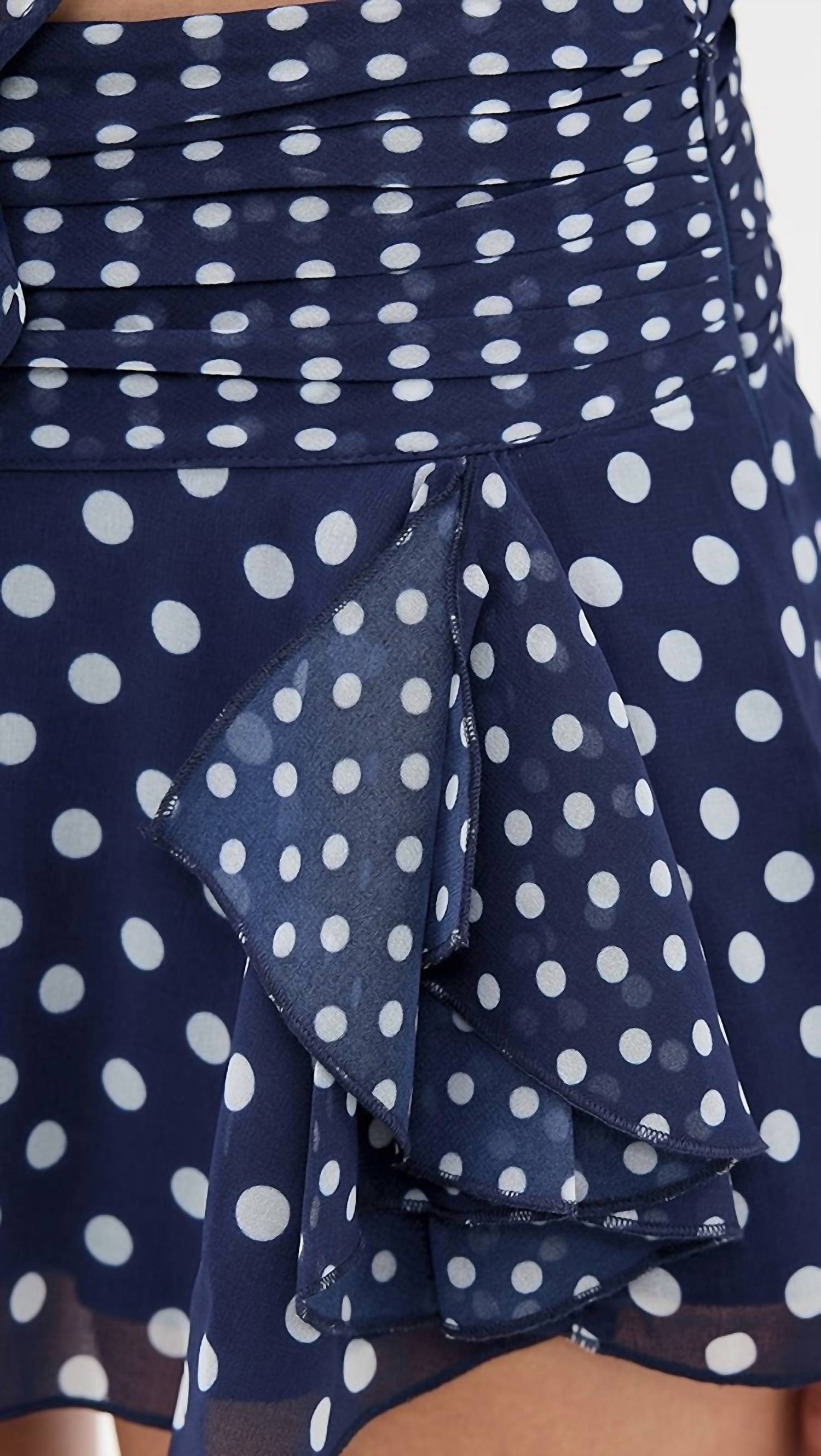 Tuck in your favorite tee for a more laid-back vibe. The Guizio Chiffon Slit Mini Skirt in Navy Polka Dot is perfect for your next holiday party. Crafted from lightweight, non-stretch chiffon with a charming polka dot pattern, this skirt features elegant ruffle detailing. Its composition includes a 100% polyester shell with a lining of 95% polyester and 5% spandex, ensuring comfort and style. The functional design is completed with a discreet hook-and-eye and hidden side zip closure. For care, simply hand wash as required.