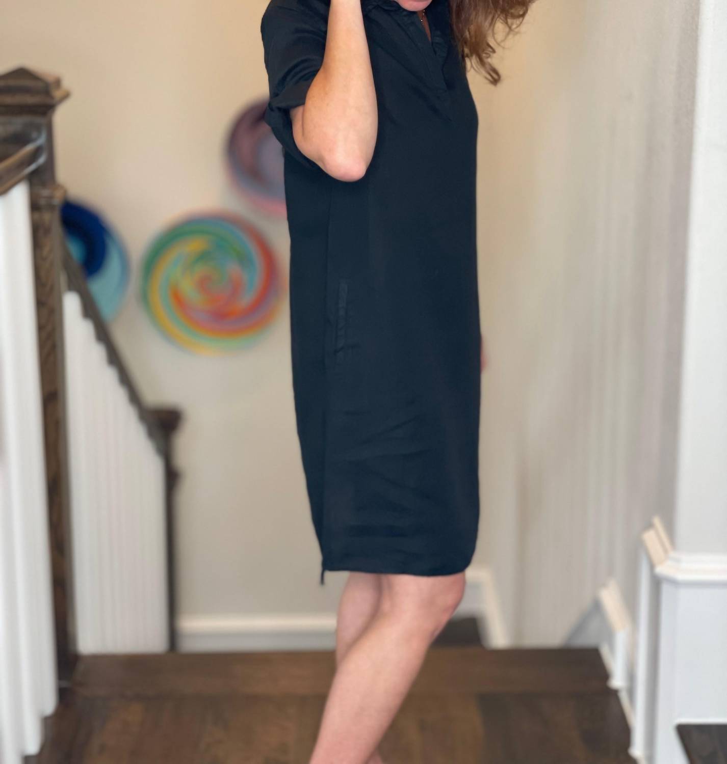 A short and breezy dress for those warmer days. The Linen Mini Dress by Pure Amici is a timeless addition to any wardrobe, perfect for occasions like Thanksgiving or a summer vacation. Featuring short rolled sleeves and practical pockets, this shirt dress is made of 100% Linen and comes in a versatile solid black. The pull-on closure ensures ease and comfort, and it is machine washable for hassle-free care. Model Cathleen is 5'4" and wears a size small.