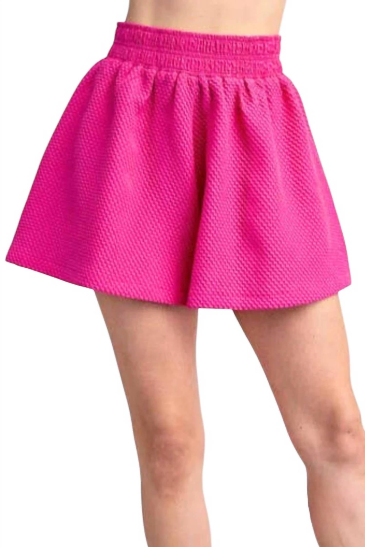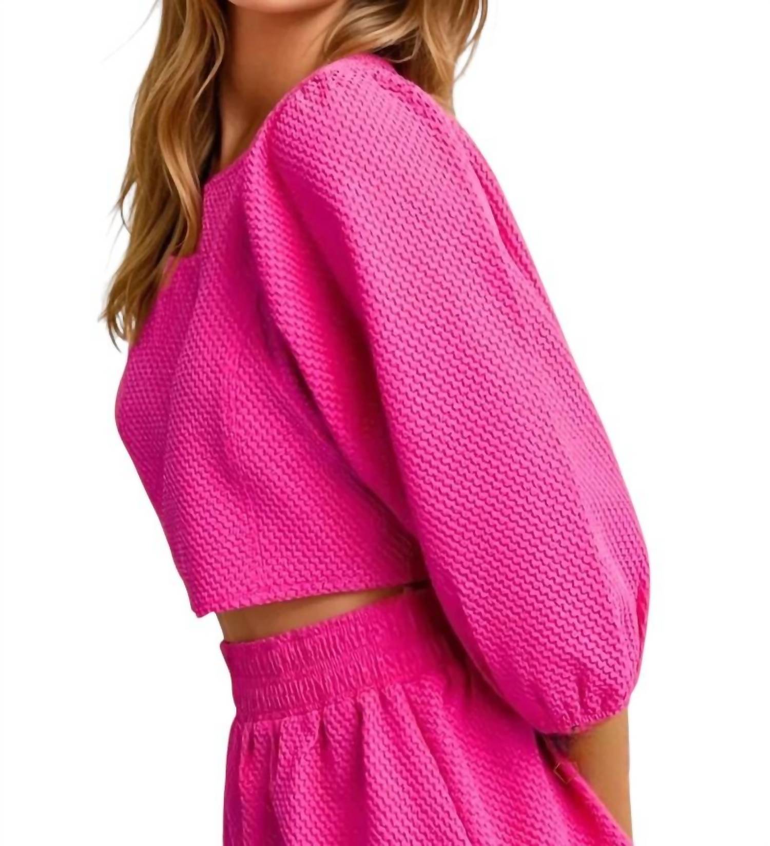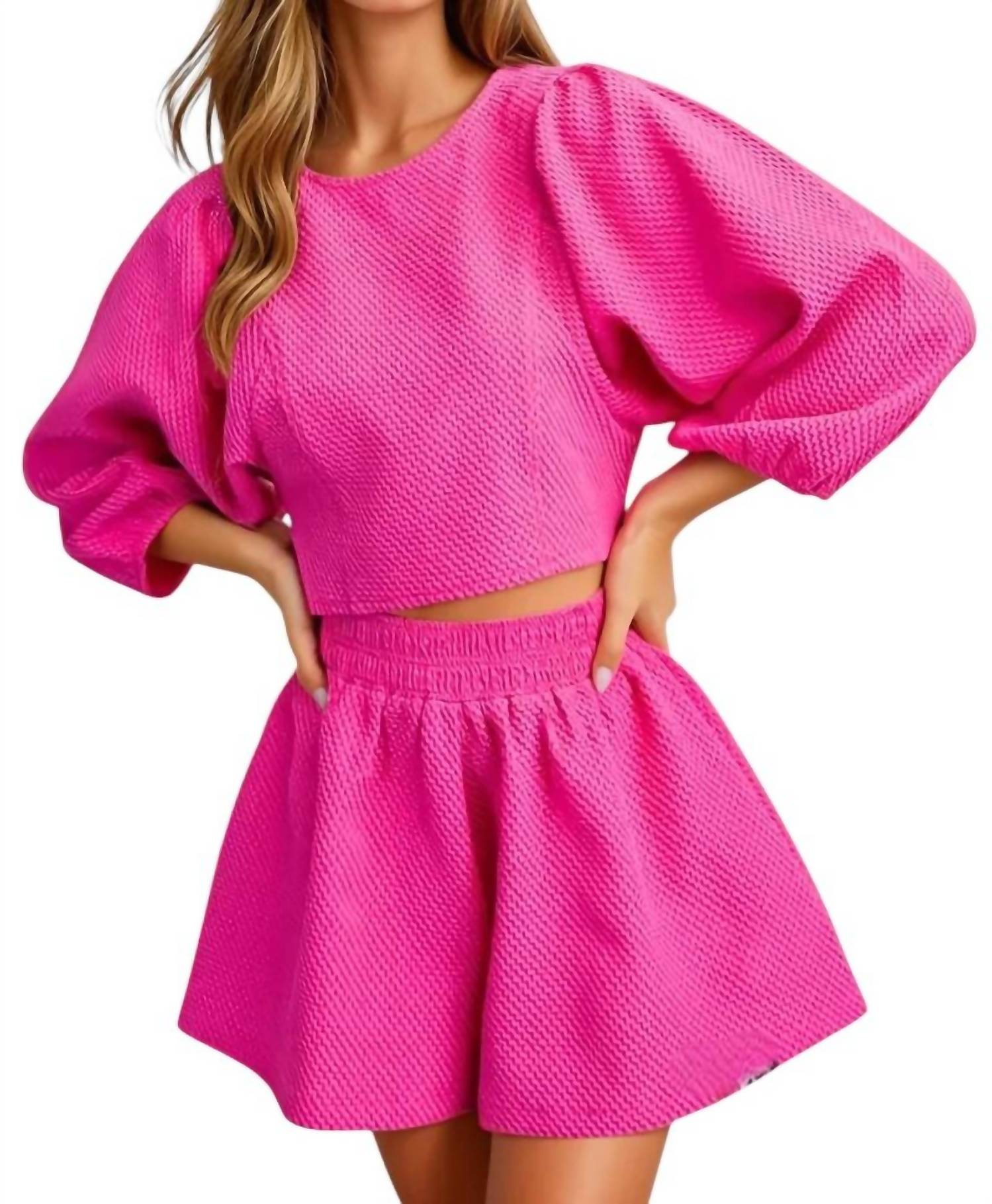A set so cute you'll never want to take it off. Designed to look good while lounging, this little number is the perfect outfit for hanging at home in style. Bold and effortlessly chic, the Catalina Round Neckline Balloon Sleeve Top & Short Set by GLAM is your go-to for warm-weather style. Featuring long sleeves, this set is expertly crafted from 100% polyester in a textured magenta fabric that exudes femininity. The top boasts a classic scoop neckline with a sleek zippered back, while the flared shorts offer comfort with an elastic waist. Made for vacationing in style, it's imported and fits true to size (S: 2-4, M: 6-8, L: 10-12). Care instructions include hand wash cold, do not bleach, hang to dry, and do not dry clean.