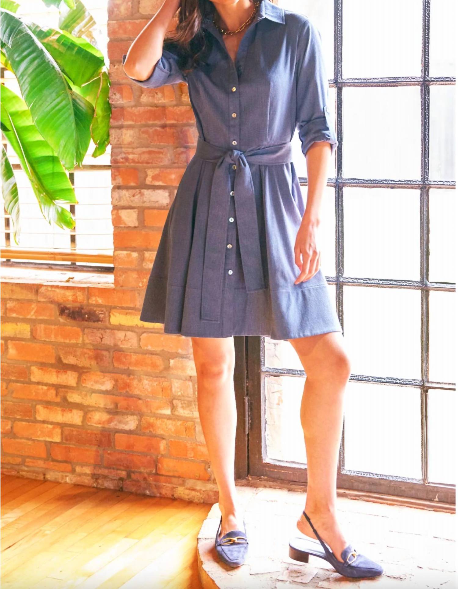 A short and breezy dress for those warmer days. Introducing the Short Laine Midi Dress by Finley, a sophisticated choice in blue designed for both style and functionality. This shirt dress features short sleeves and a classic collar, crafted from 62% Cotton 32% Polyester 6% Lycra. Manufactured in the USA, it ensures a refined and minimalist appearance perfect for an active schedule. Closure: Button closure. Care: Hand or machine wash.