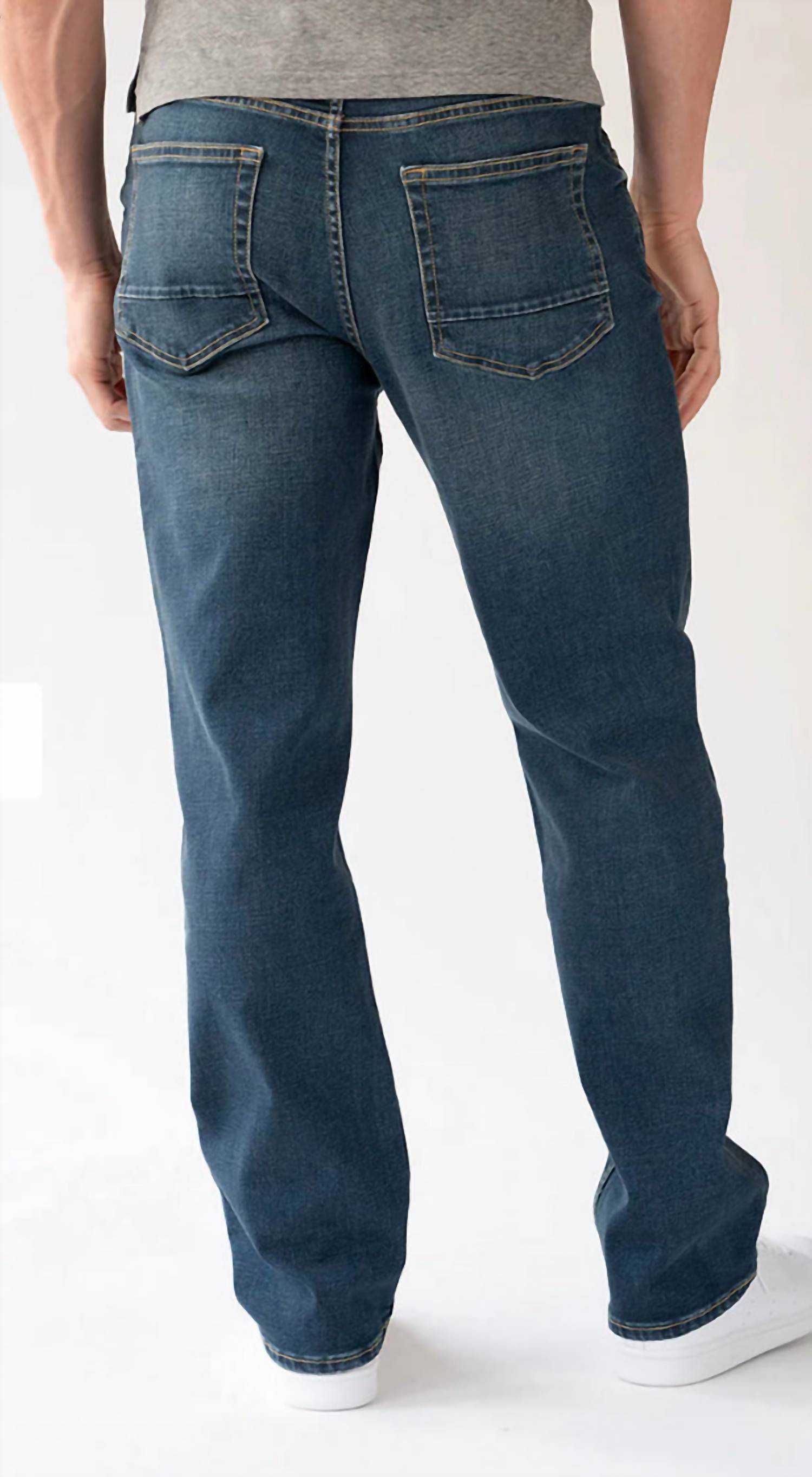 Discover the Burke Relaxed Straight Jeans by DEVIL-DOG, designed to blend comfort and sustainability with every wear. These medium wash jeans feature a relaxed fit through the thigh and a straight leg with a 17" opening, crafted from a 74% cotton, 24% polyester, 2% spandex blend. Closure: Button closure. Care: Machine wash inside out cold with like colors and tumble dry low. Suited for those who value style and ease, they include signature details like front whiskering, five-pocket construction, and authentic bandana pocketing made from REPREVE® recycled fibers. Model is 6’ tall and is wearing a 32x32.