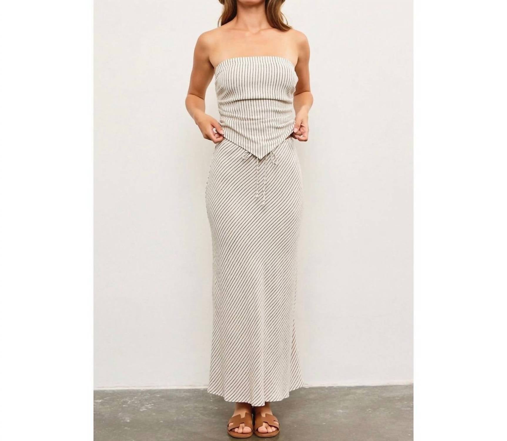 Unveiling the Hannah Striped Skirt & Tank Set by Mustard Seed, the epitome of effortless elegance for your spring wardrobe in soothing oatmeal tones. This women's set displays playful stripes, offering a boho chic touch perfect for any occasion, from beach days to dinner parties. Crafted without pockets, this set features a convenient pull-on closure. Model is wearing a size small (5'8" height, 33.5" chest, 28.5" waist, 40" hip, 30" inseam).