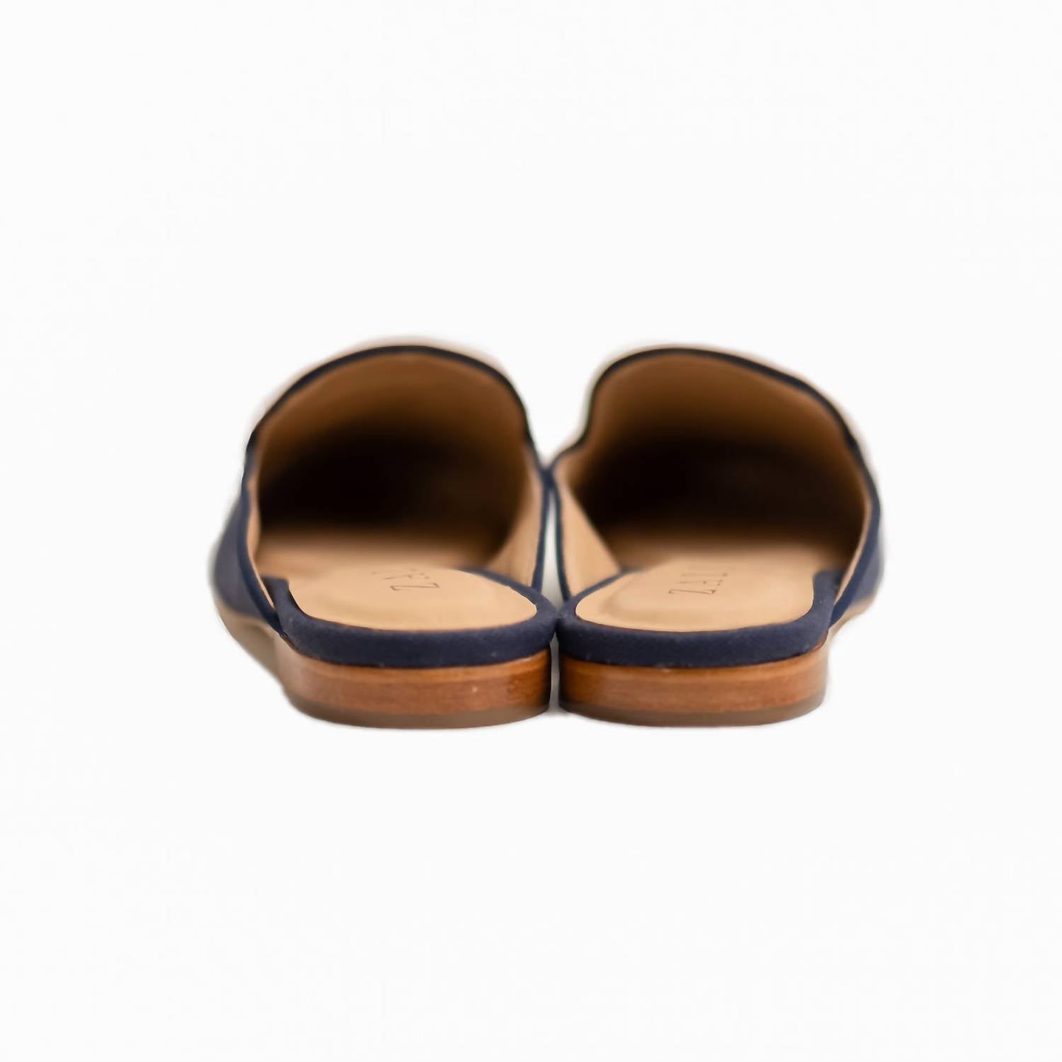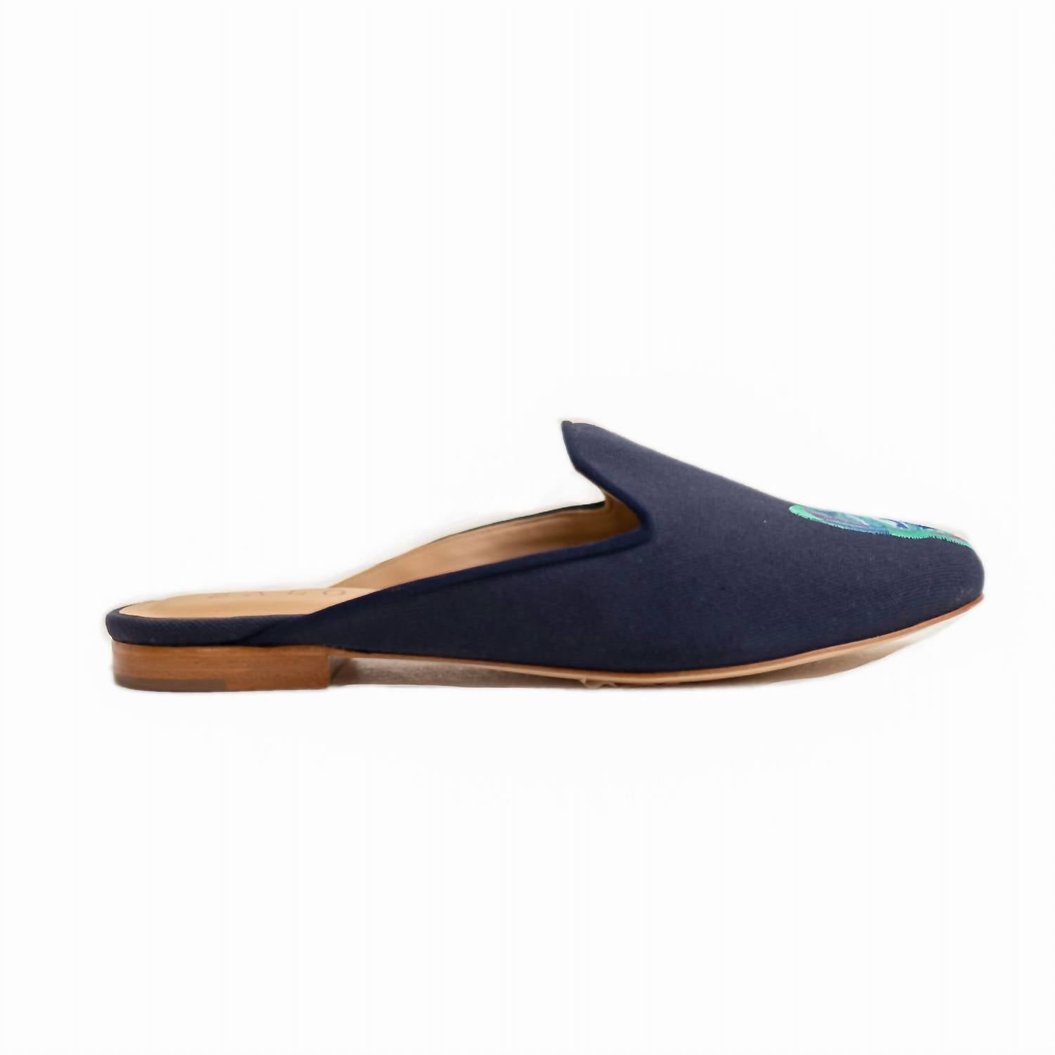Our Lobster mule features a navy cotton canvas upper with matching grosgrain trim and our blue lobster embroidery. Napa leather lining for additional support and comfort. .75 inch leather stack heel. Leather sole. Canvas is treated to be water-repellent.
