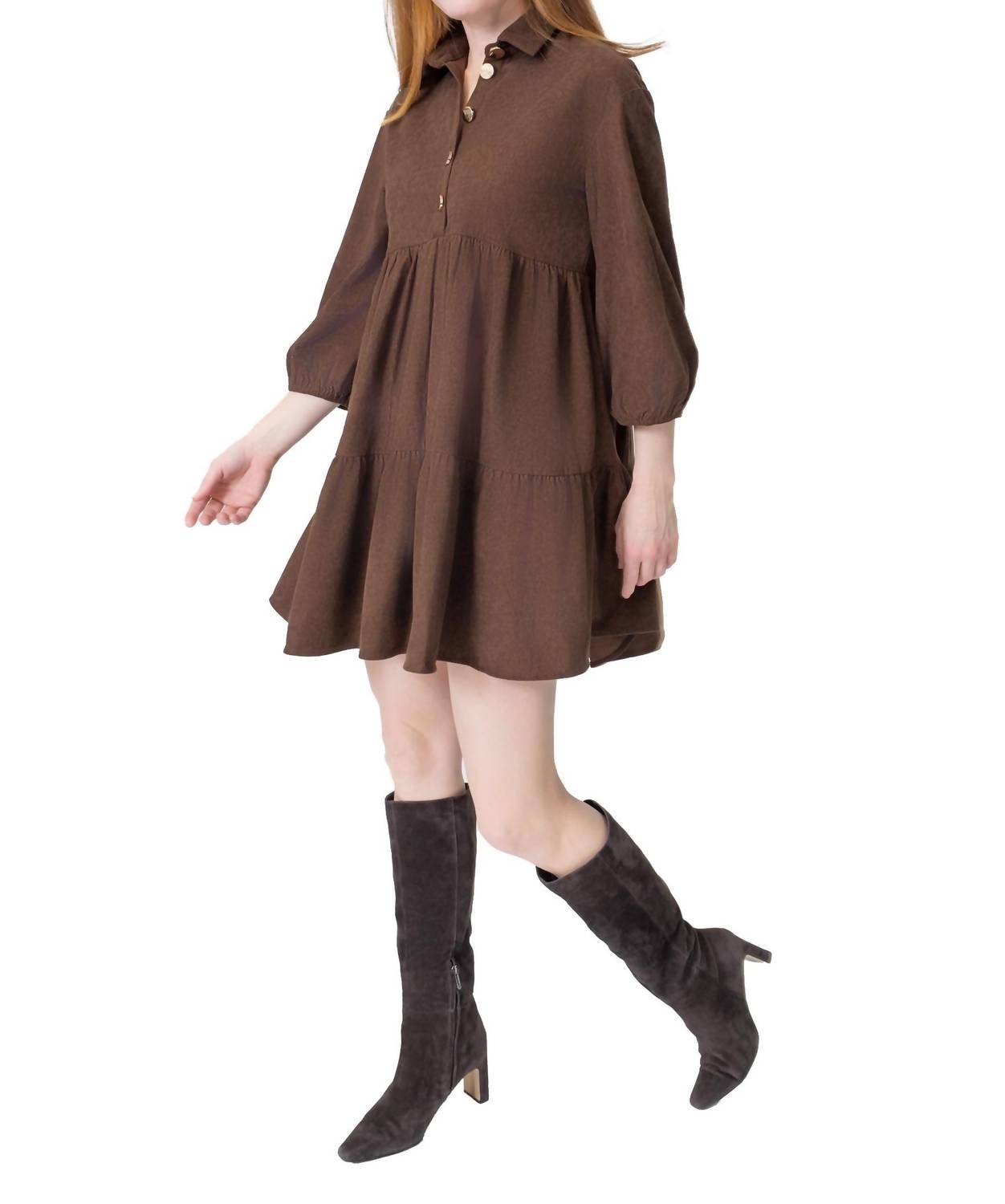 The kind of easy and flattering dress you'll be reaching for all season long. Elevate your spring wardrobe with the Cosette Mini Dress by Area Stars, a perfect blend of quiet luxury and stylish simplicity. Crafted from 55% linen and 45% viscose, this long-sleeve A-line dress features a solid brown hue ideal for Easter and other evening events. The dress is designed with a collared neckline and button closure, completing its graceful silhouette. Care instructions include hand washing and line drying to maintain its elegant structure.