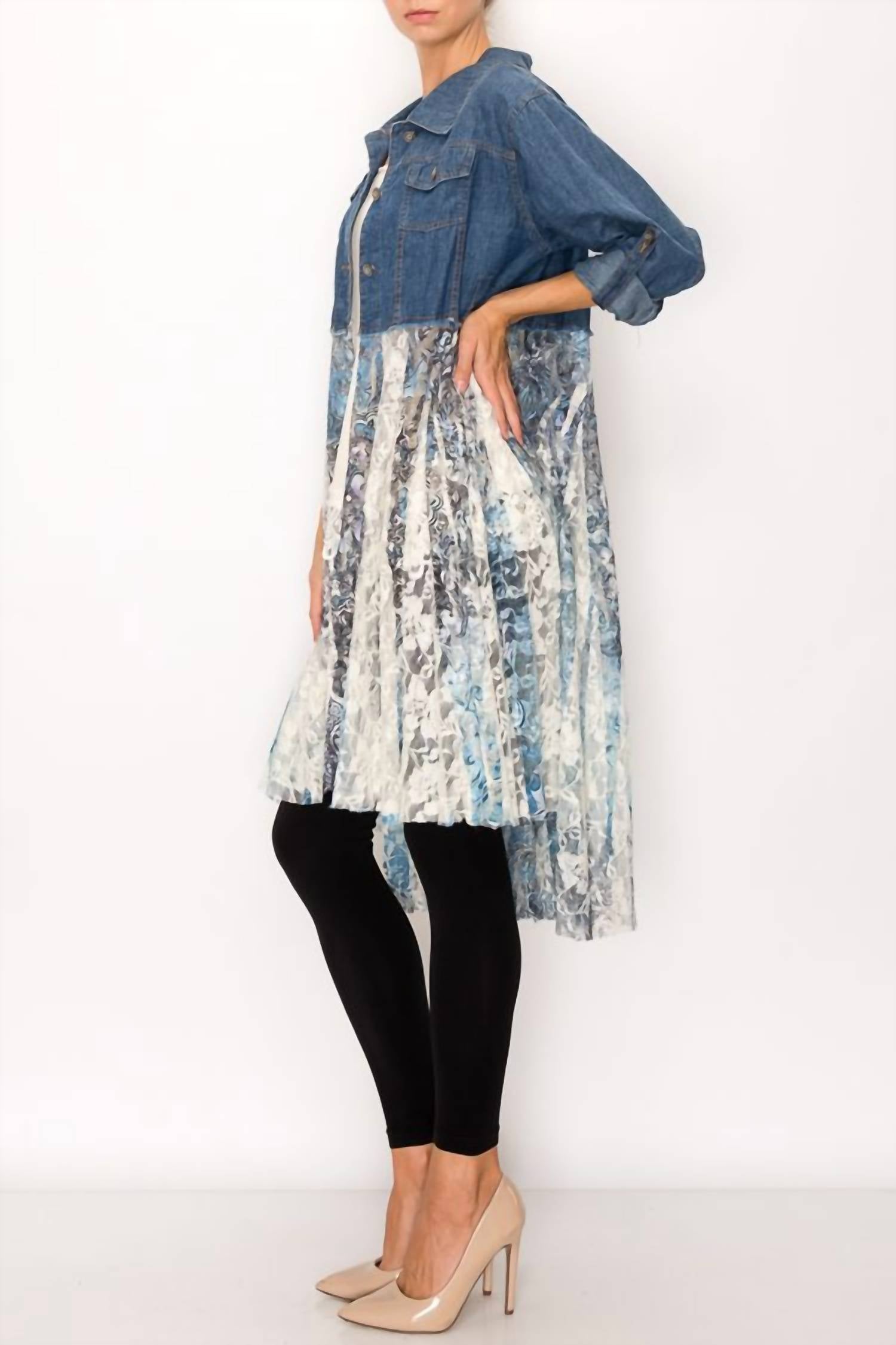 The kind of easy and flattering dress you'll be reaching for all season long. Elevate your wardrobe with the Origami Denim & Lace Duster, a chic layering piece perfect for any occasion. This long sleeve duster combines a 100% cotton denim top with a beautifully patterned lace layer of 90% nylon and 10% spandex, offering a unique blend of textures. With an asymmetrical hemline, button closure on the denim portion, and added features like frayed detailing and two front pockets, it provides both style and functionality. Sizing varies from Small/Medium to 3XL, with lengths ranging from 35" to 40", making it an adaptable piece for various occasions. Care instructions recommend hand wash and line dry, with this piece being an imported summer favorite.