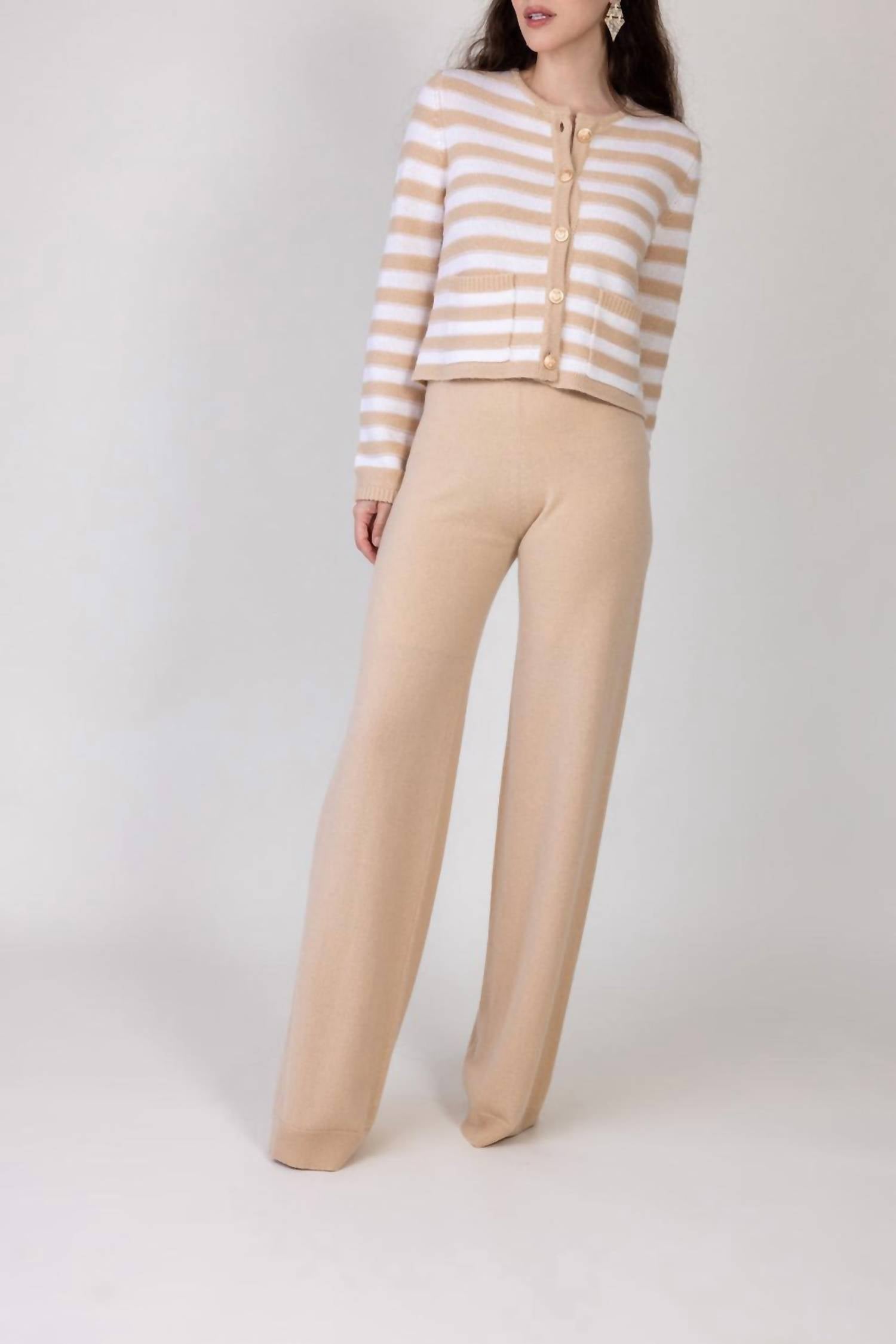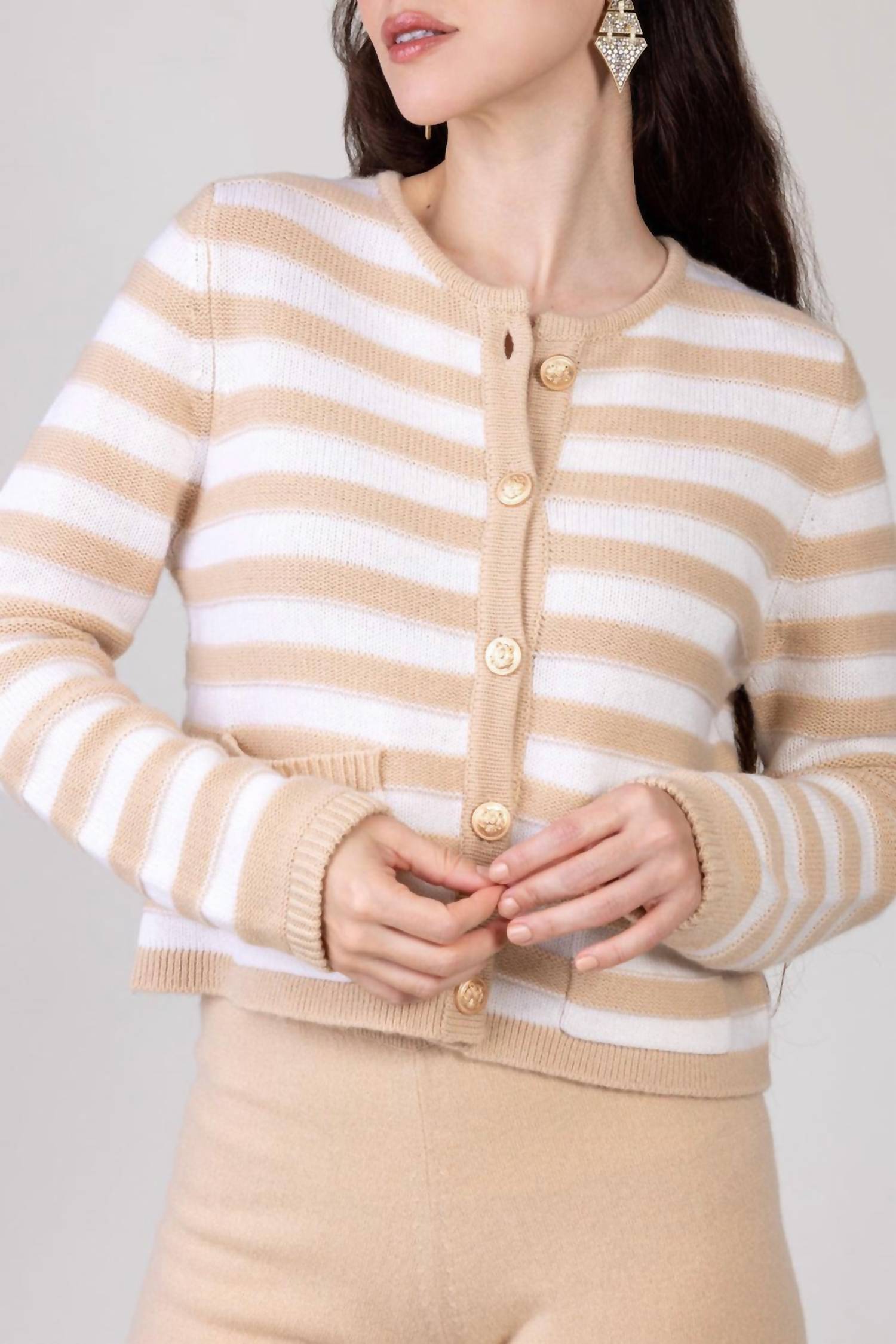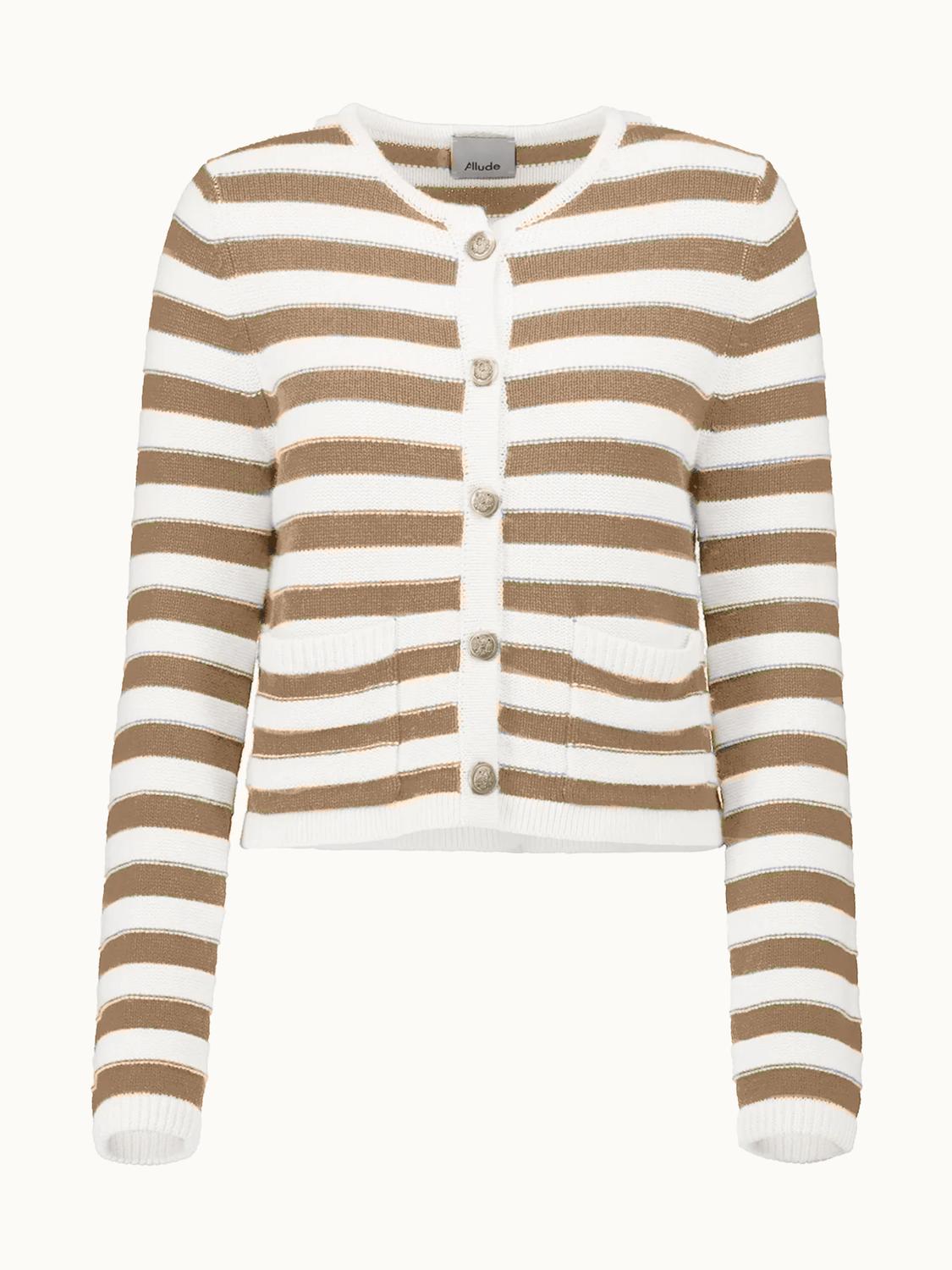 This cardigan will be a sweater-rotation favorite. Discover the Crewneck Button-up Cardigan by Allude, a harmonious blend of comfort and style in macadamia and fleur de sel stripes. This long-sleeve cardigan boasts a luxurious composition of 70% wool and 30% cashmere, designed for the minimalist fall wardrobe. Featuring a classic button closure and functional front pockets, it effortlessly elevates any vacation look. Care for this wool blend garment by hand washing and laying it flat to dry.