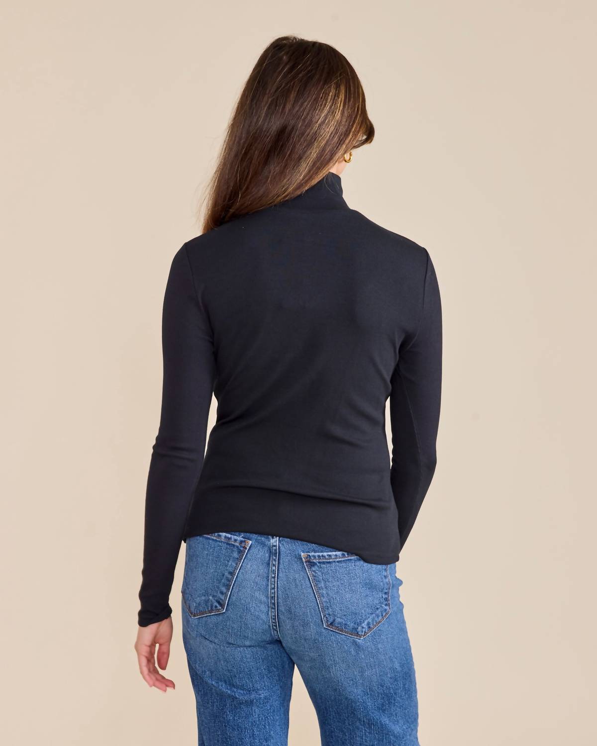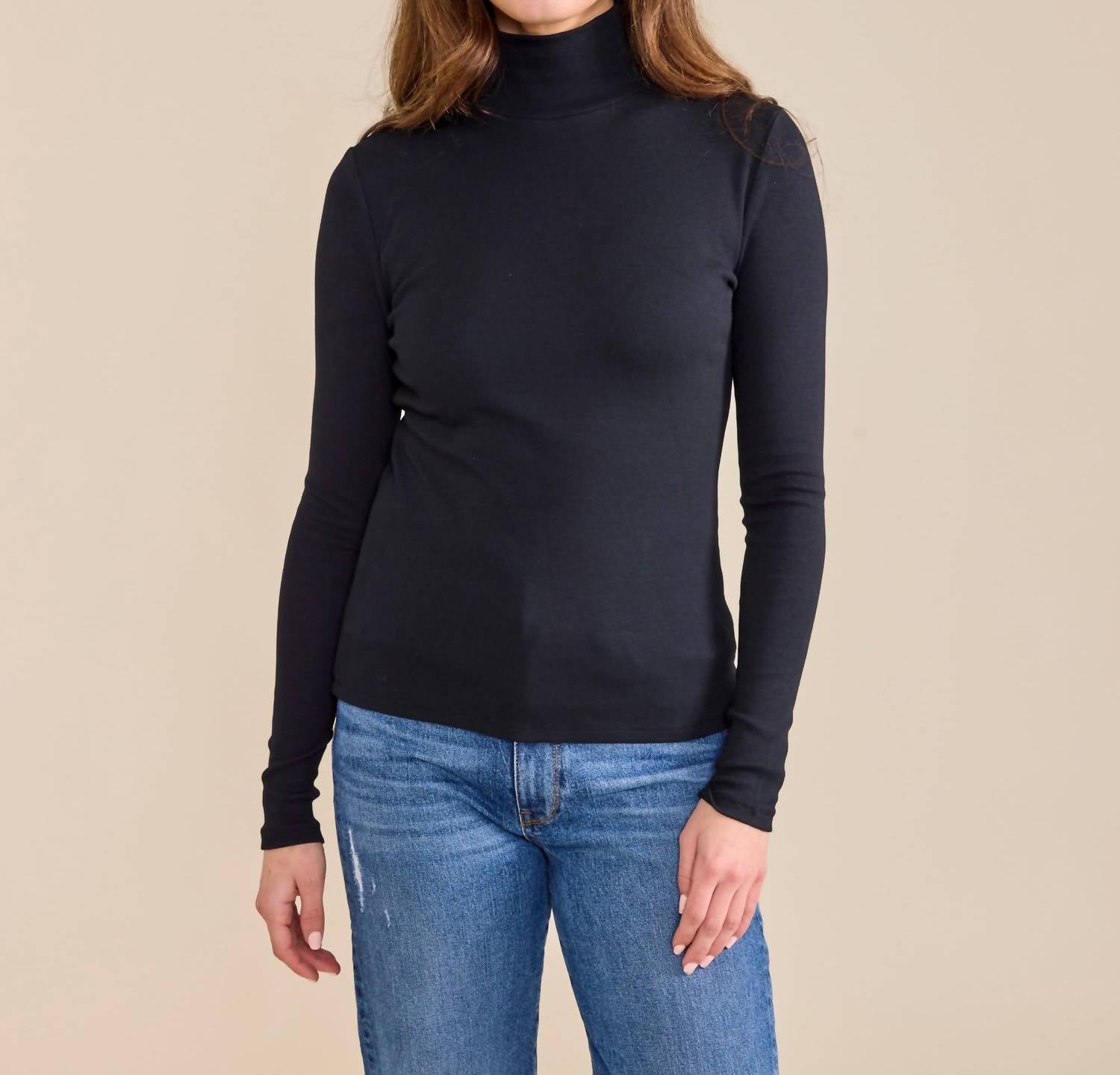 Layer under your favorite sweater or wear tucked into jeans for a perfectly polished winter look. This black turtleneck features long sleeves and boasts a flattering 25-inch garment length. Made from a cotton blend composition of 58% Cotton, 38% Rayon, and 4% Spandex, it offers comfort and style with a convenient pull-on closure. Care for this piece with machine wash cold and lay flat to dry for long-lasting wear. Model is 5'9" and wearing a size S.