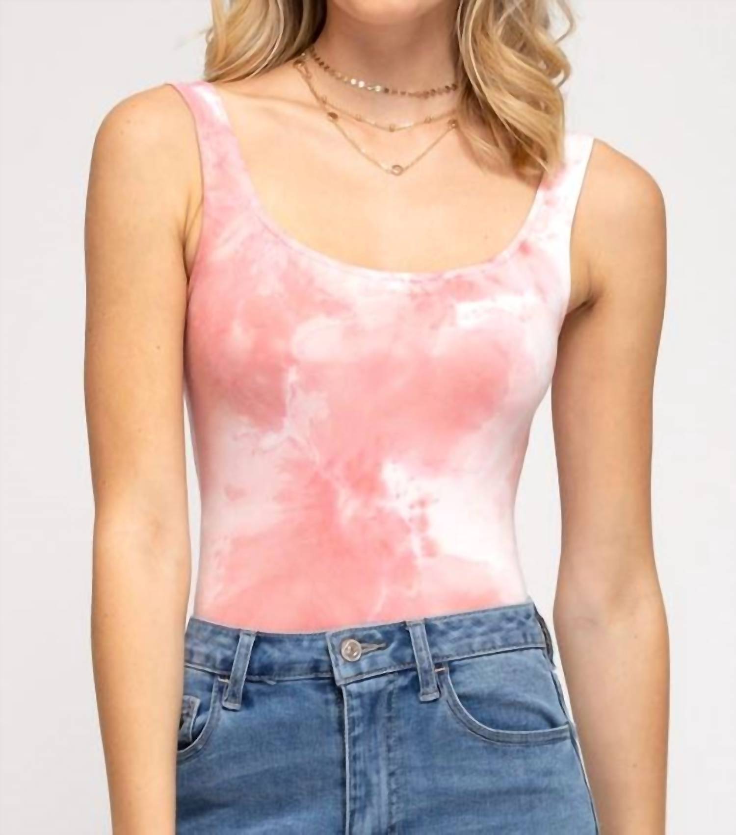 Grab your favorite jeans or denim shorts and favorite sneakers for a super comfy and cute look with this sleeveless tie dye knit bodysuit with snap closure.