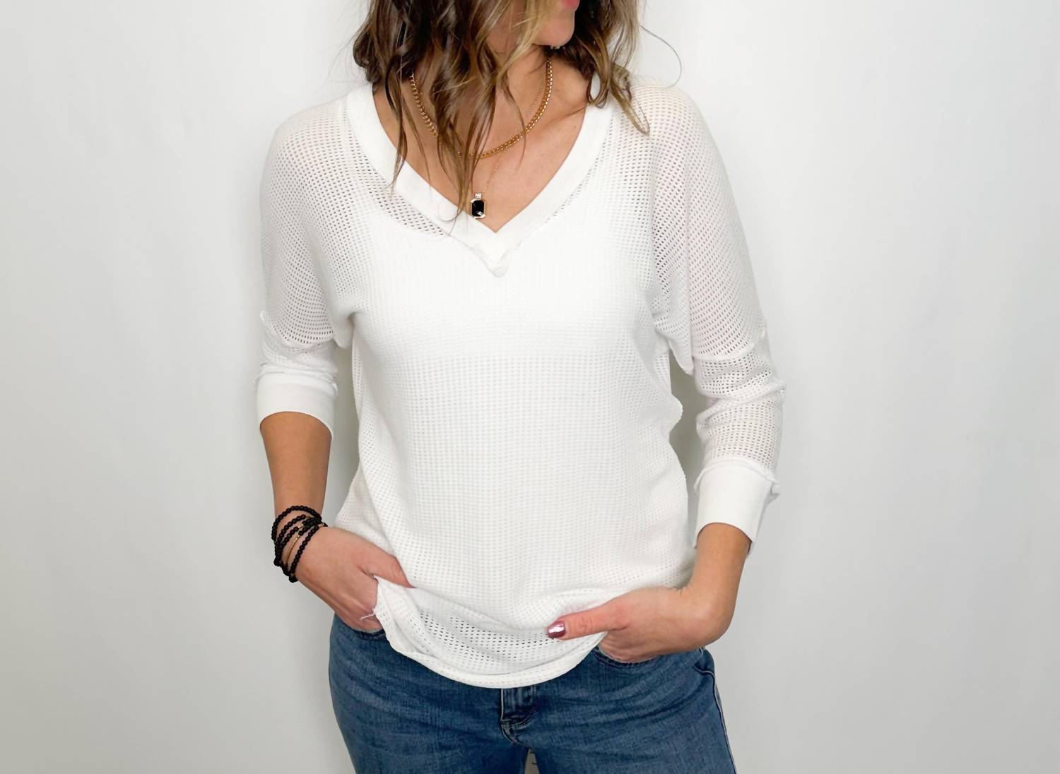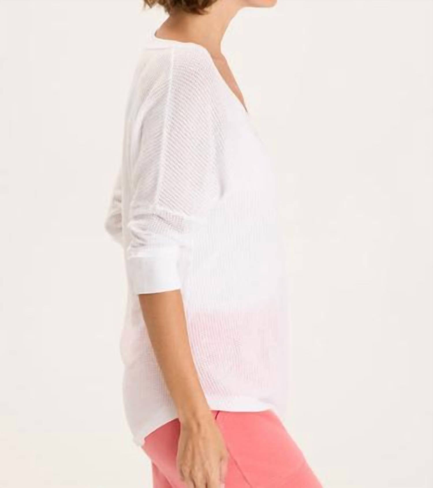A timeless v-neck sweater that works season after season. Elevate your casual wardrobe with the XCVI Mesh Fira Pullover, featuring three-quarter sleeves and a sophisticated V-neckline. Crafted from a comfortable Cotton Blend of Tencel Cotton Mesh, this textured piece offers a relaxed fit ideal for spring. With a center front length of 18.25" and center back length of 26", it is designed to flatter the silhouette. Closure: Pull-on style ensures easy wear. Care: Machine washable and preshrunk for your convenience. Imported.