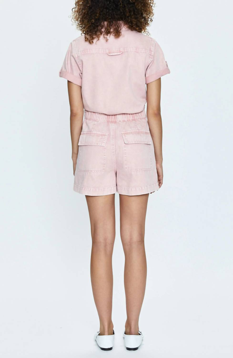 It doesn't take much for this one piece to look effortlessly cool. Add some statement jewelry to dress it up, or throw on some sneakers for a more casual vibe. Introducing the Campbell Aviator Romper by PISTOLA, a stylish utility-inspired piece in Rose Quartz. This romper features practical short sleeves with button roll-tab cuffs and a back elastic waist for all-day comfort. Made from 100% cotton, it offers a hidden-snap placket and a variety of pockets including chest zip-patch, front slant-patch, and back flap-patch pockets. With a 32" length and 3.5" inseam, it's machine washable and can be tumble dried, enhancing its appeal for everyday ease. Imported for quality and convenience.