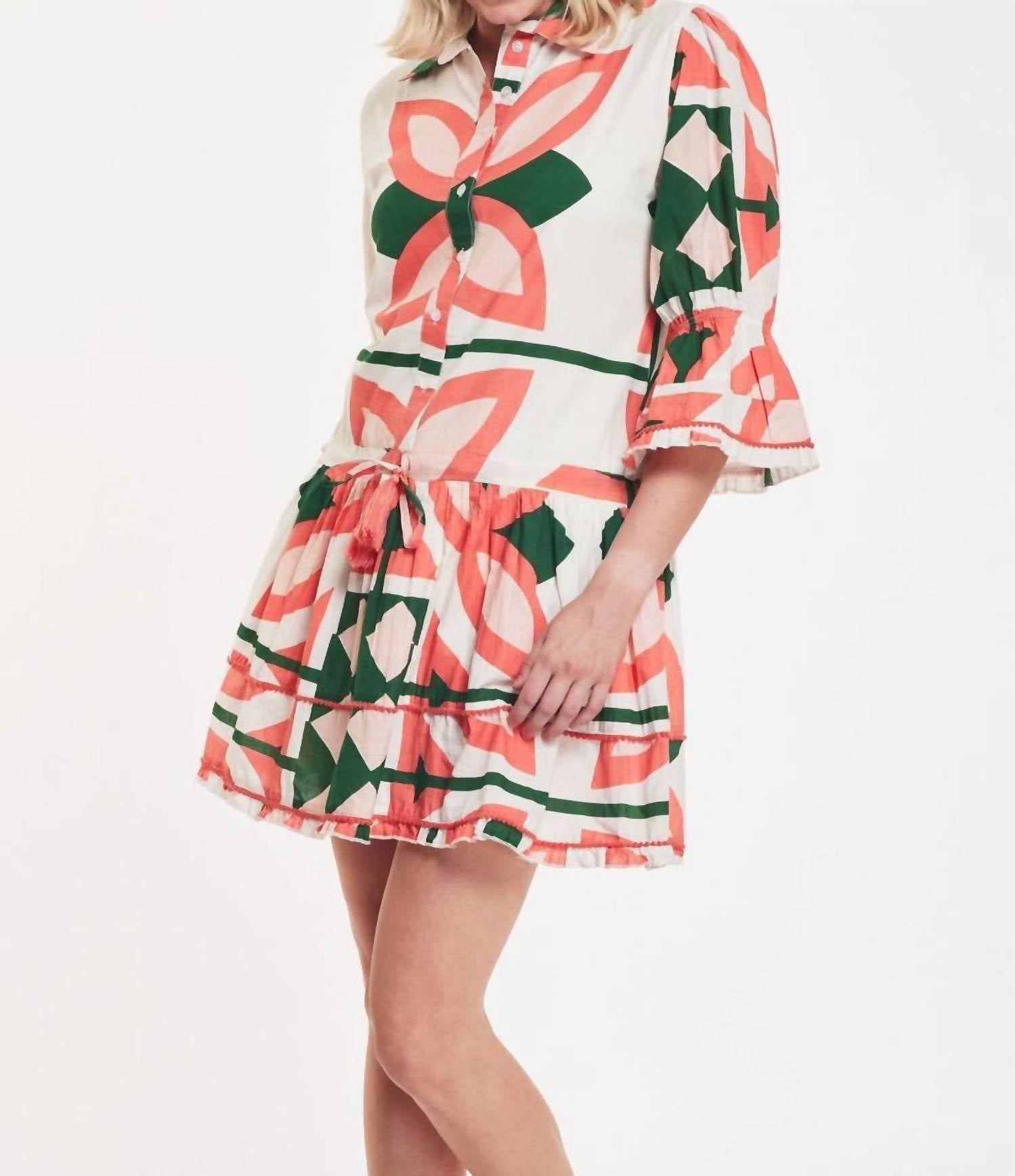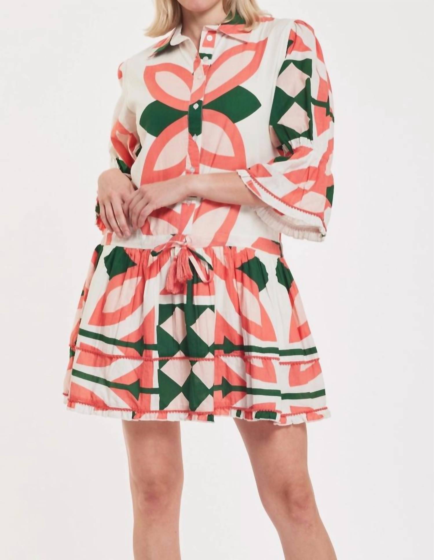 The kind of easy and flattering dress you'll be reaching for all season long. Discover the vibrant Penelope Dress Moroccan Abstract by MODAPOSA, a must-have for any fashion enthusiast. This mini dress features playful three-quarter flared sleeves, crafted from comfortable cotton and adorned with an eye-catching pink and green abstract print. Designed with a smart collar and A-line silhouette, it includes convenient buttons for closure. Care instructions recommend machine wash and line dry for lasting elegance.