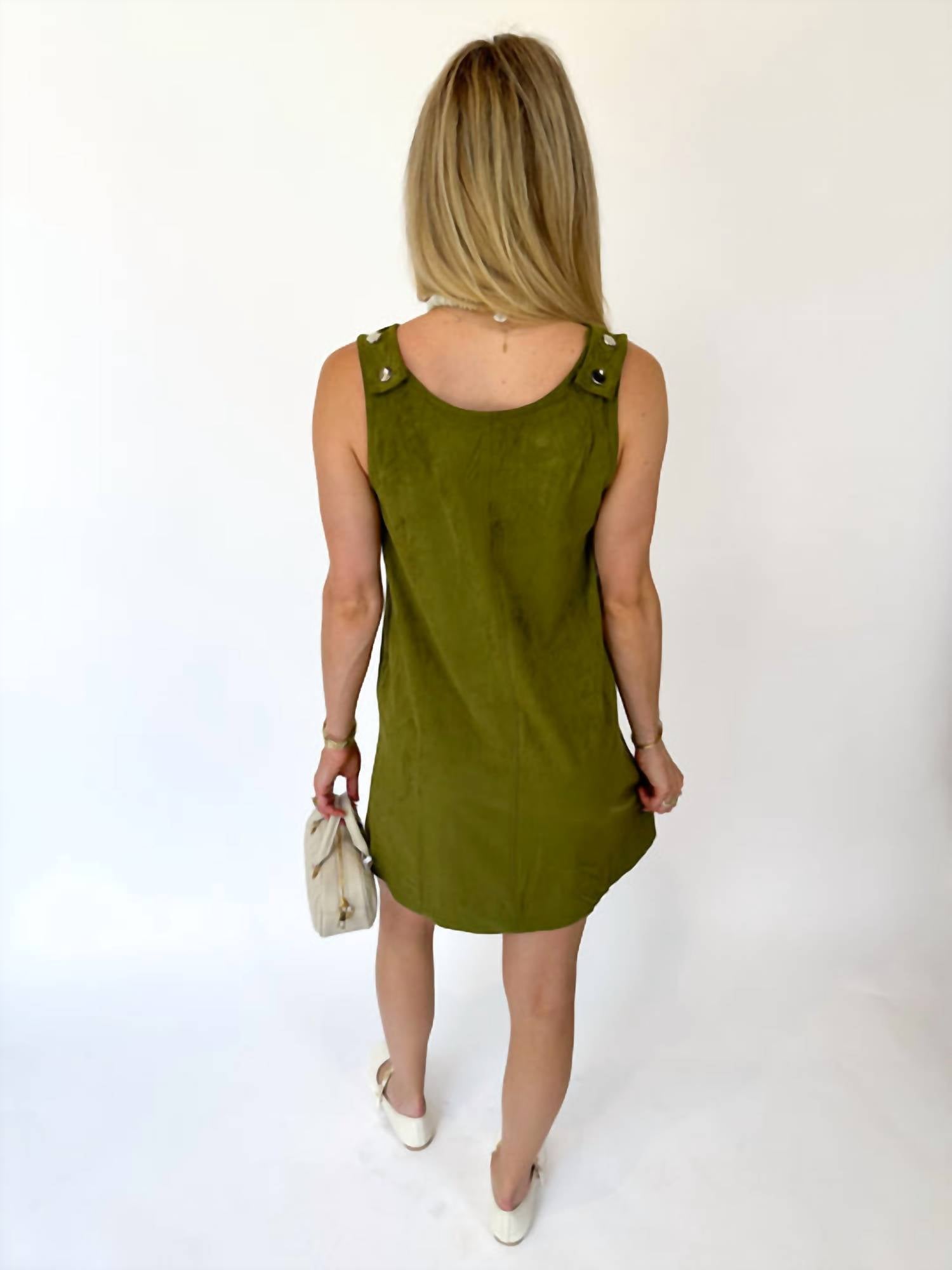 The perfect mini dress for those warmer months. Elevate your wardrobe with the Needii Suede Overall Mini Dress in a rich olive green hue, a perfect blend of playful retro charm and polished style. This sleeveless, solid-patterned mini dress is crafted from soft suede, featuring a scoopneck and flattering sheath silhouette. Closure: Snap Closure. Care: Machine wash.