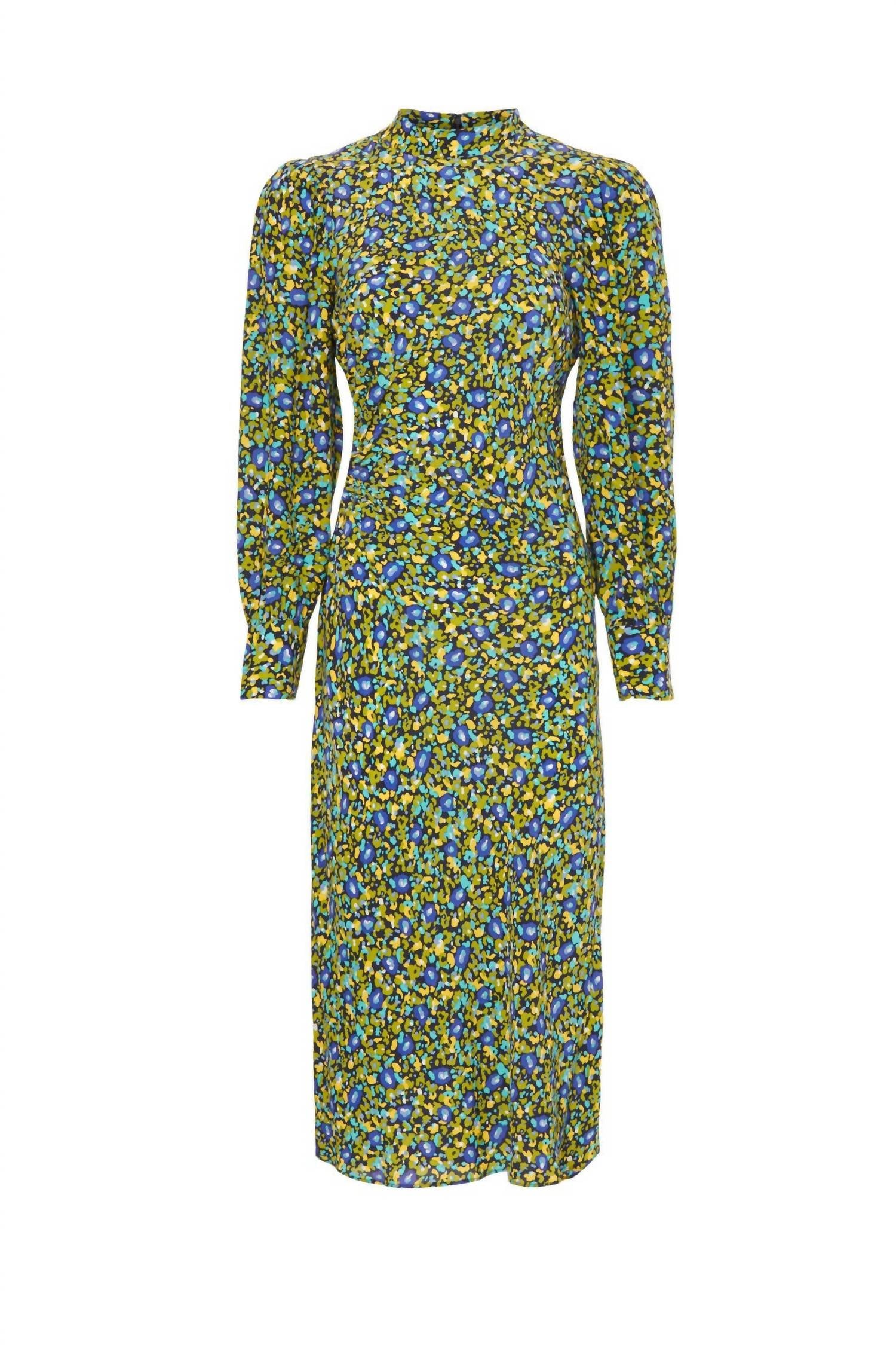Meet the Rails "Carmel Dress" in Abstract Garden, a statement piece for this season's events. Featuring long puffed sleeves and a daring side cut-out, this floral sheath midi dress includes a mockneck for added elegance. Crafted from 70% Rayon and 30% Viscose, this dress is equipped with a convenient zip closure. It is imported and measures 46 1/4" in body length for a size Small, with care instructions recommending dry clean only. The model is 5'10" and wears a size S, perfect for any maximalist spring evening or New Year's Eve occasion.