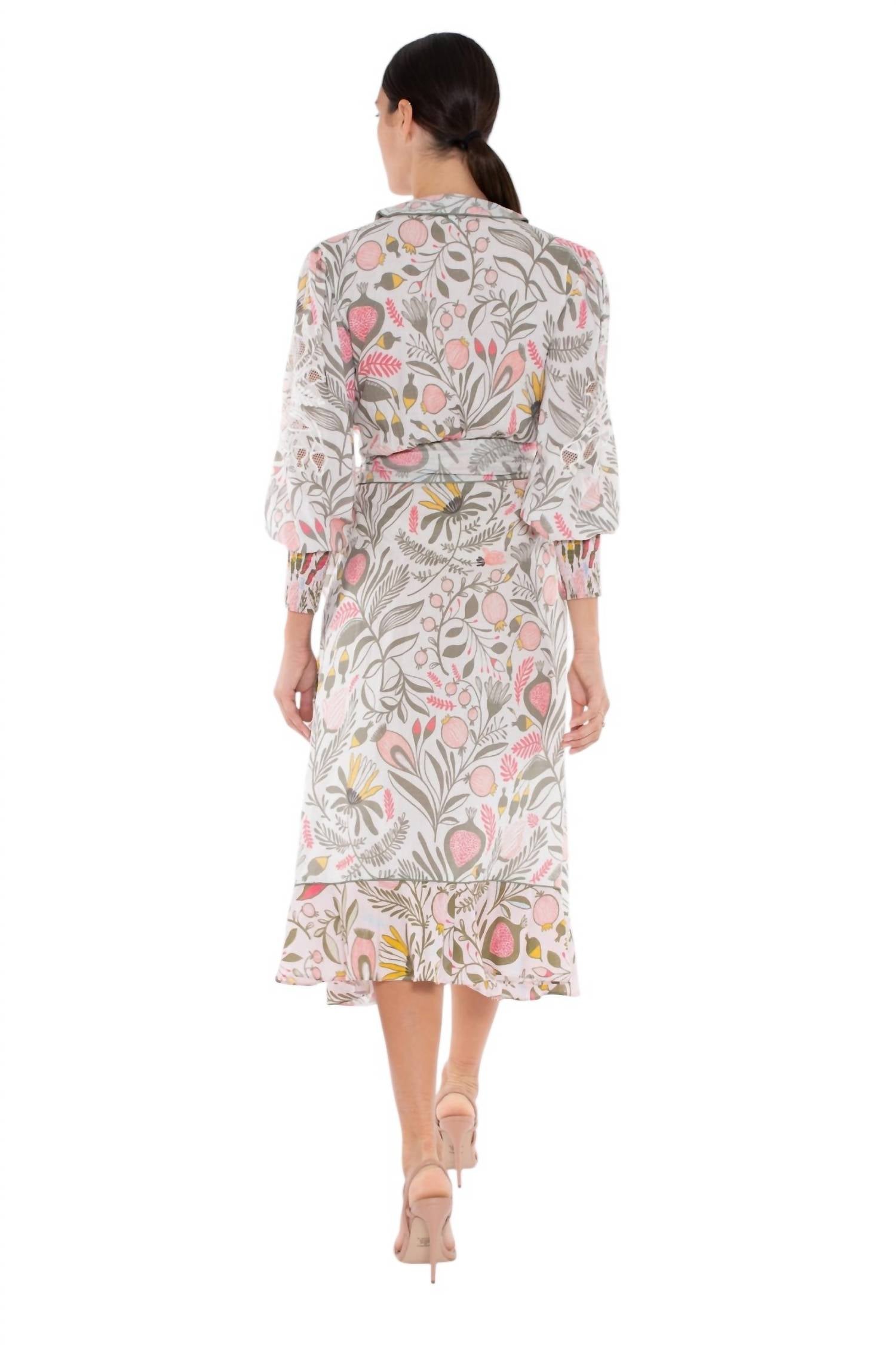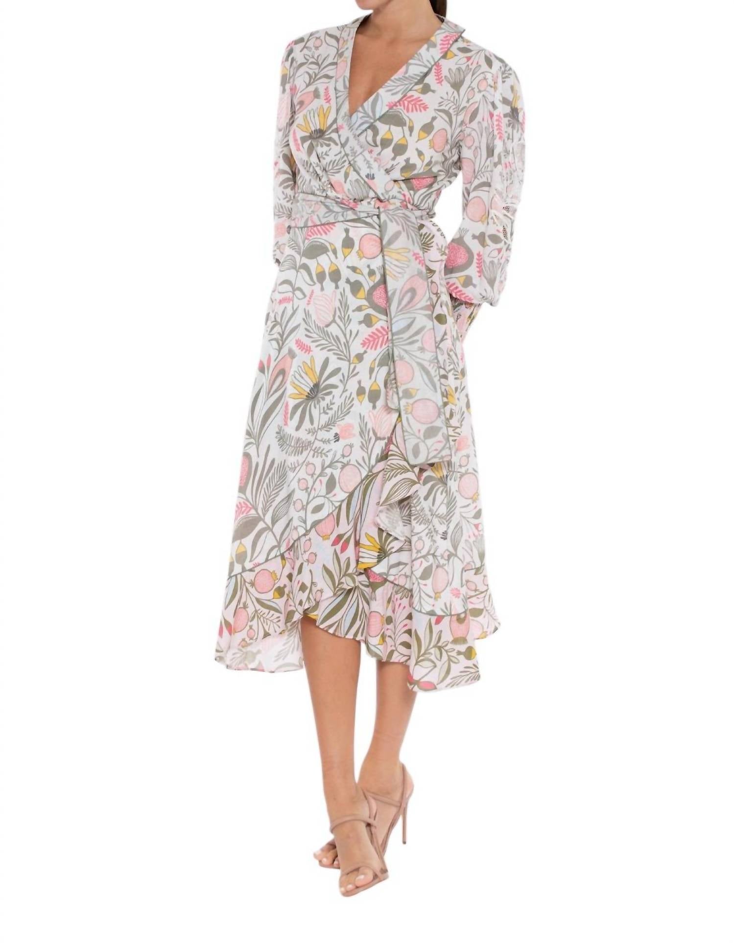 Unveil the AELLO DRESS by TAJ by SABRINA CRIPPA, a striking piece adorned in a Combo Mille Flowers pattern. This women’s midi dress showcases an elegant A-line silhouette with three-quarter sleeves and a V-neckline for a flattering fit. Crafted with a wrap design and a convenient tie closure for customizable comfort and style.