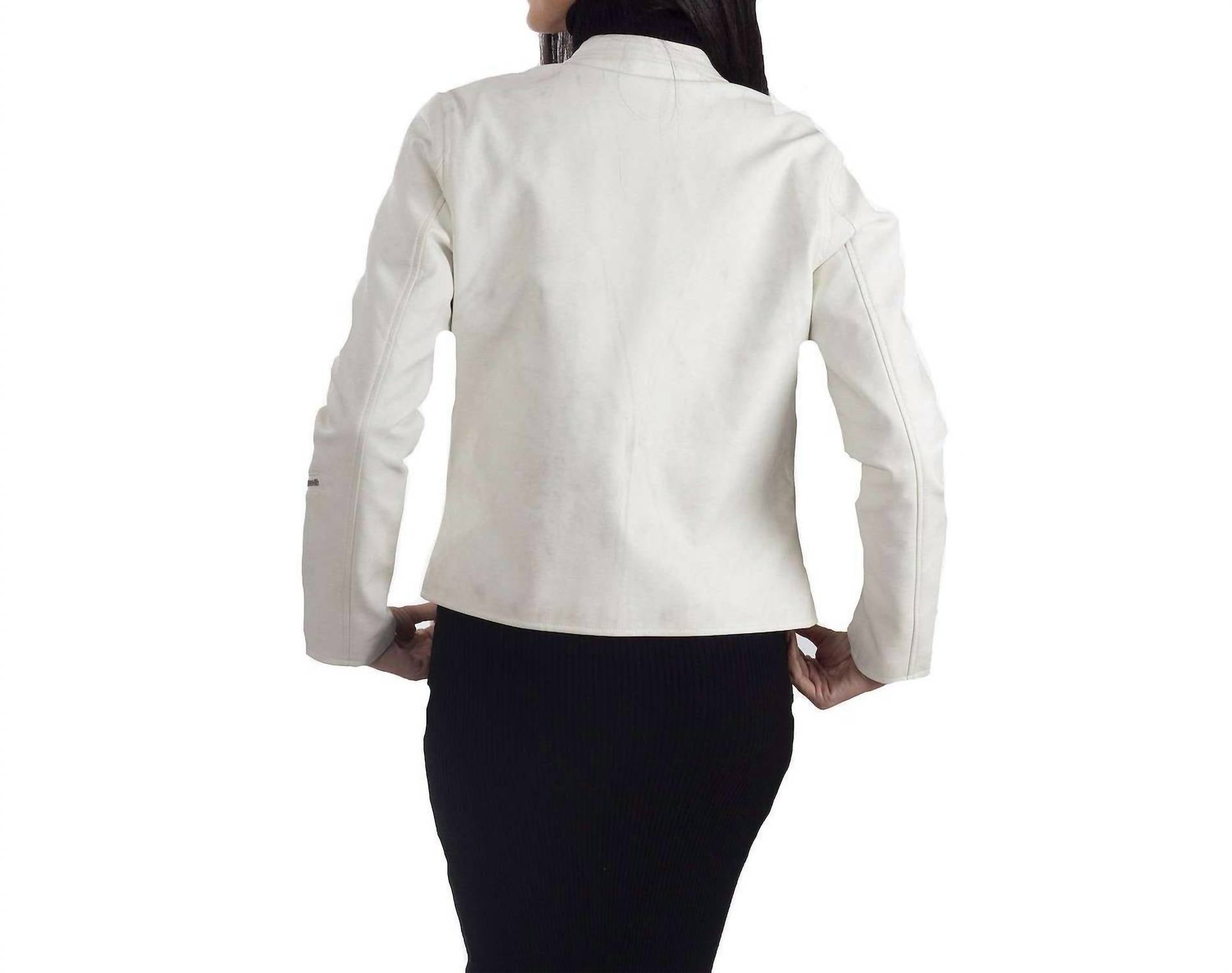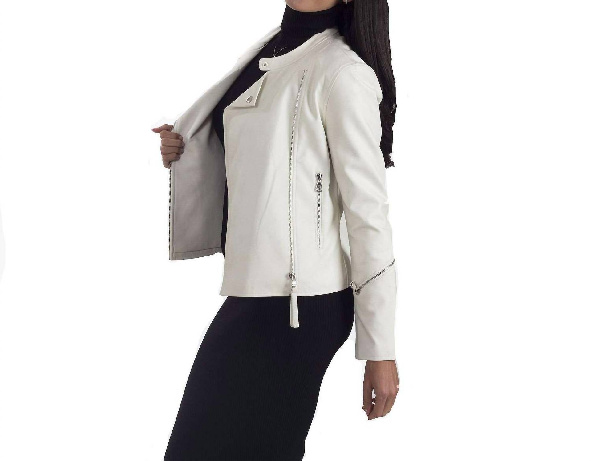 Faux-leather construction. Asymmetrical zipper front with snaps at the collar. Long sleeves. 2 exterior pockets, 1 hidden interior pocket. Designed to hit just below the waist. Midweight. 100% Polyurethane. Dry clean. Imported.