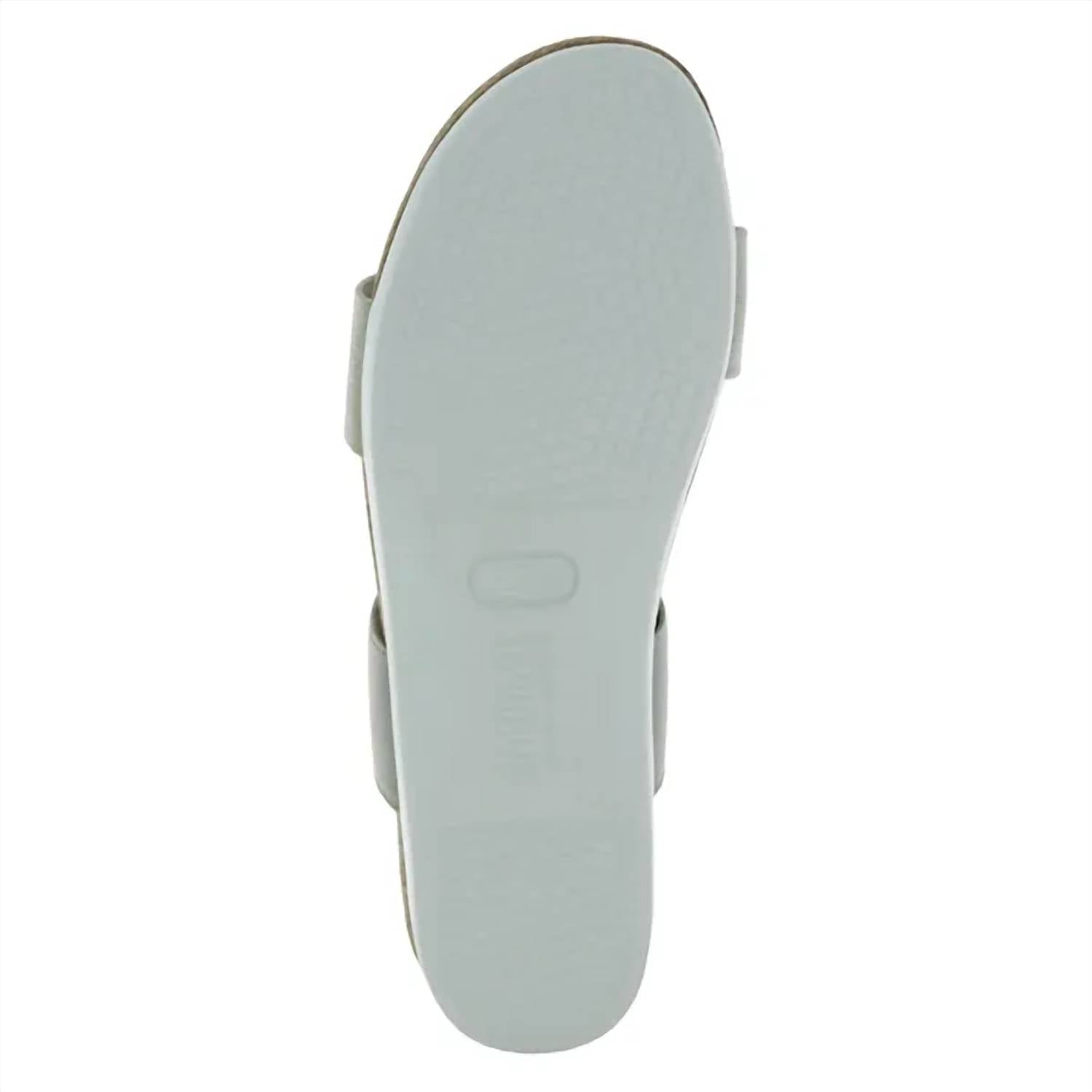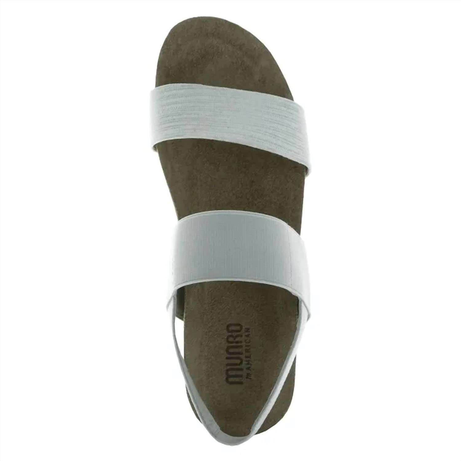 Classicly cute and all-day-wearable. We love this sandal. Discover the Women's Pisces Elastic Sandal by Munro, perfect for your next vacation. This American-made slingback sandal in white and grey features a slip-on closure and an open toe design. The upper is crafted with stretch fabric, while the durable cork and latex outsole ensures support and shock absorption. With a heel height of 0.5 inches, it offers excellent arch support and comfort thanks to the non-removable cork footbed and breathable microfiber lining.