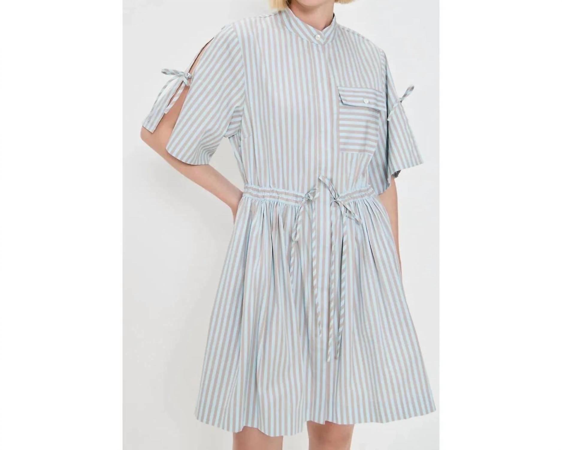 The perfect mini dress for those warmer months. Introducing the Febe Dress by Hevron, a chic mini-length piece in an elegant ice blue stripe. This dress boasts wide, short sleeves and is crafted from 100% cotton poplin, offering both comfort and style. Featuring a mandarin collar and button closure, it allows for a relaxed fit enhanced by a self-tie drawstring belt for a more defined silhouette. Care instructions recommend dry cleaning or machine washing on a cold gentle cycle and laying flat to dry. Measurements include a waist of 35", a bust of 37.5", and a length of 35". Model is 5'9" wearing size 2.