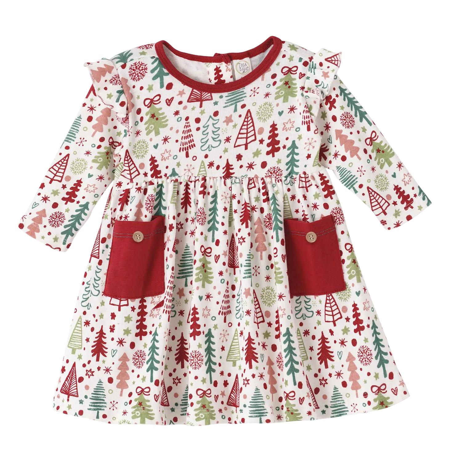 Festive print featuring whimsical trees, stars, and bows in holiday greens and reds. Two red front pockets and a matching red neckline. Back button closure.