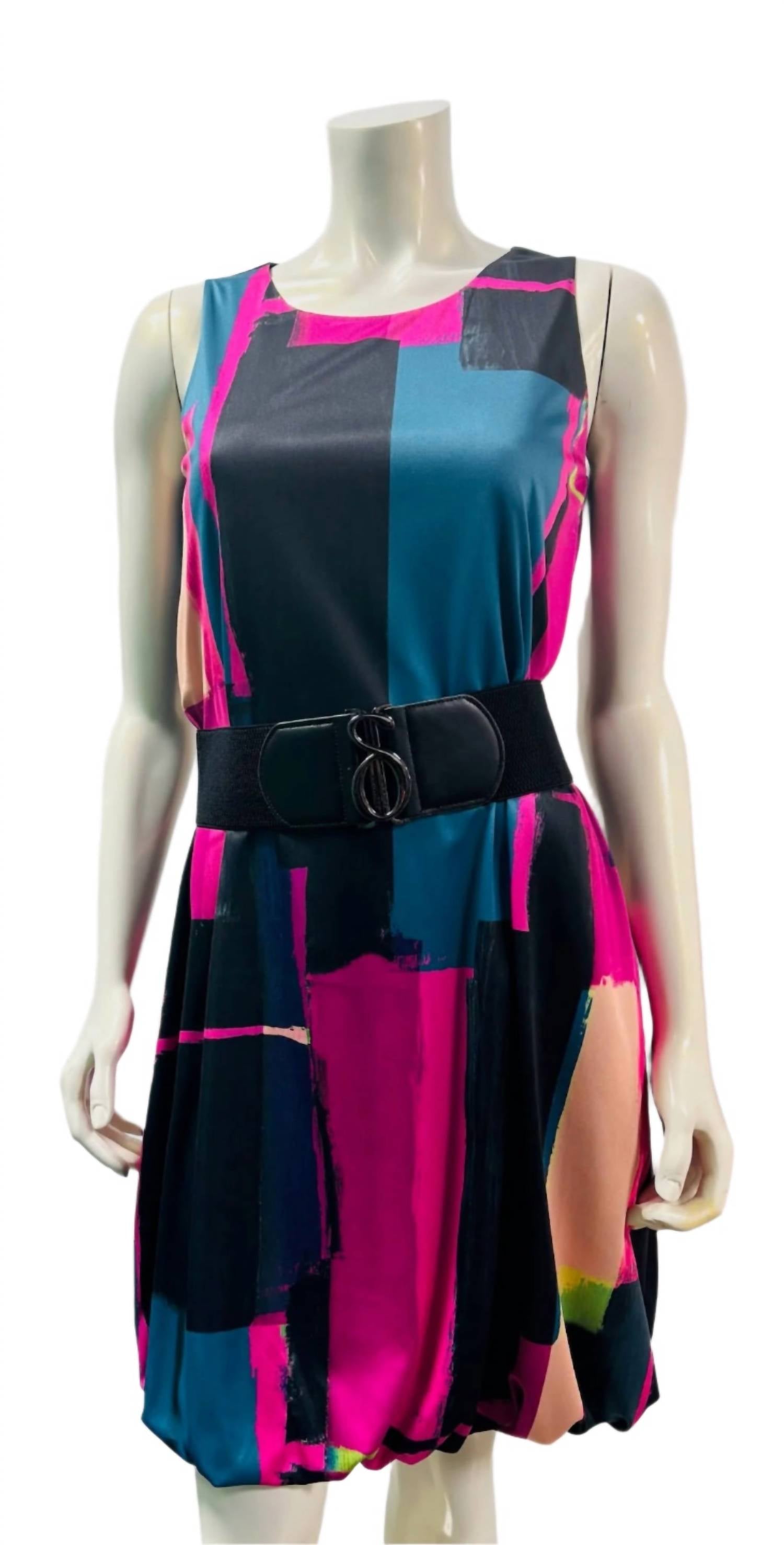 The perfect mini dress for those warmer months. The Samuel Dong Bubble Dress is a vibrant addition to any wardrobe, showcasing a playful print in a striking Black Multi color. Designed with a classic crewneck and sleeveless silhouette, this shift-style mini dress offers both style and functionality with its convenient pockets. Perfect for any occasion, it's an eye-catching piece that promises to stand out. Note: Belt shown is not included.