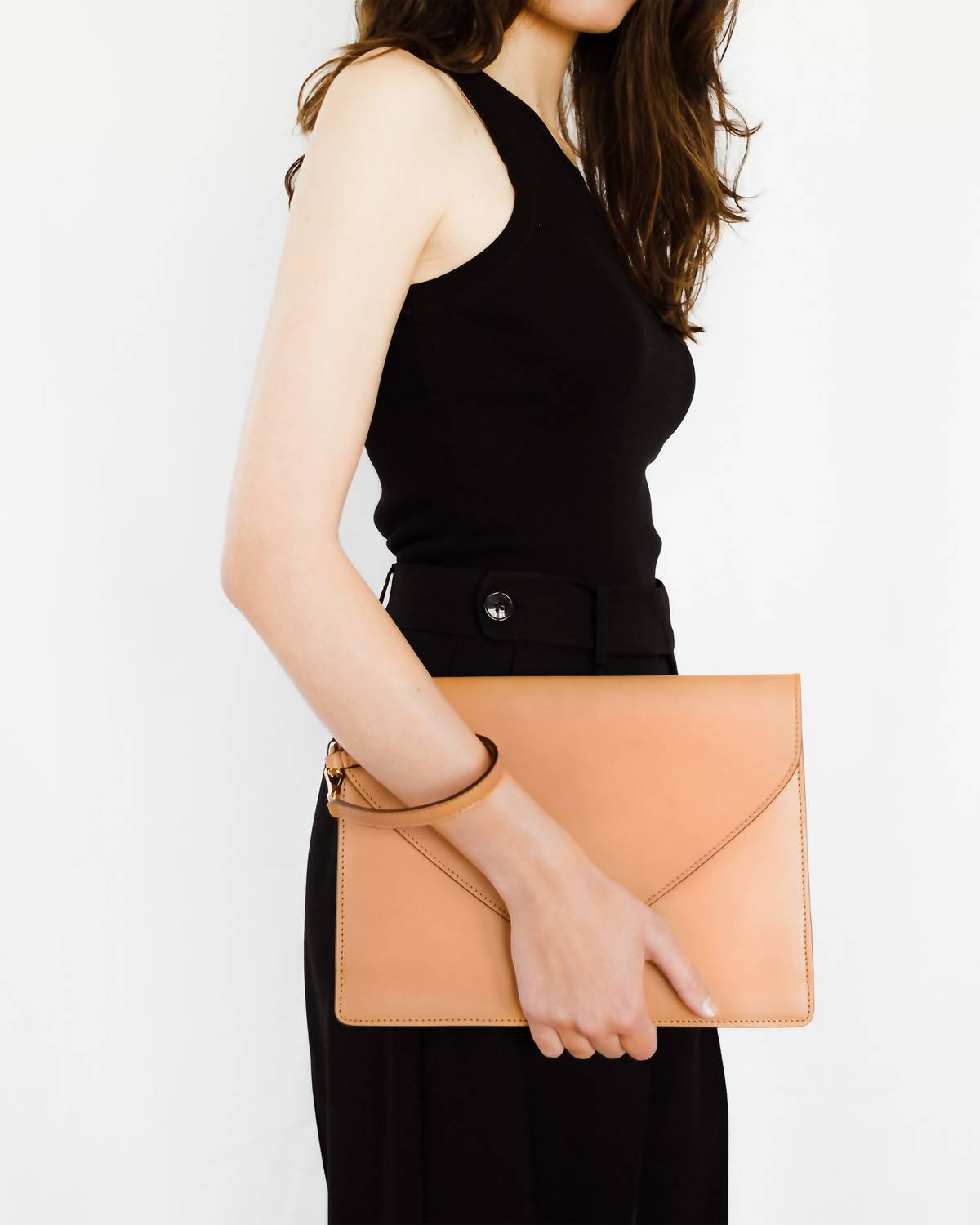 Lipstick, check. Mints, check. Credit card, check. The cutest little bag that holds all of your necessities. Presenting the Women's Envelope Clutch by MODHER, crafted meticulously for stylish practicality. This clutch, made in Italy, features a soft suede interior to keep your essentials protected, and a hand-stitched leather magnetic closure offers secure fastening. Dimensions: 11.5" width x 8.2" height. The wristlet strap adds versatility, making it perfect for carrying your tablet or other small items with ease.