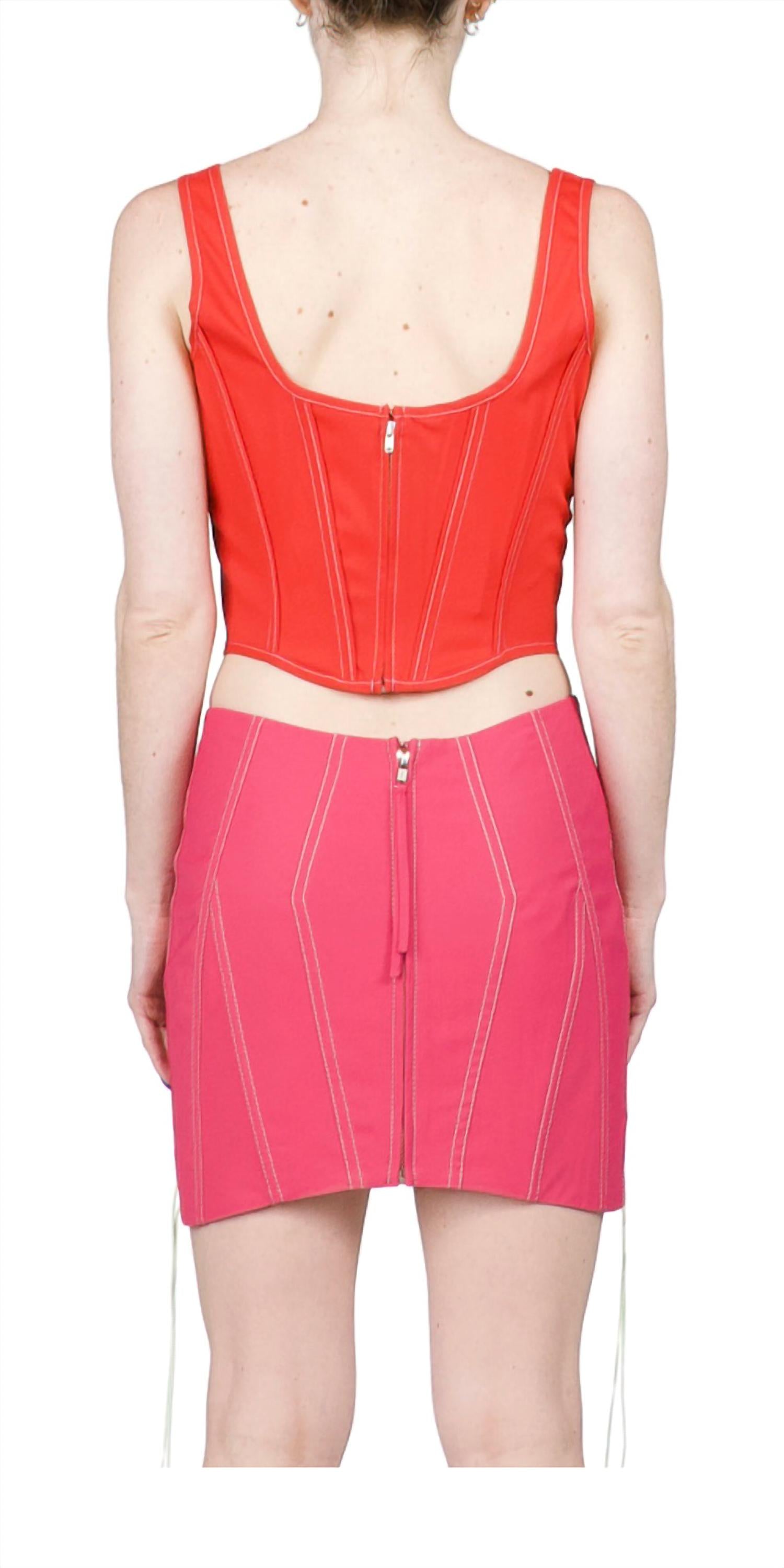 The perfect crop top for those warmer weather days. Introducing the Sleeveless Corset Top by PRISCAVera, an alluring piece crafted in NYC that captivates with its chili red hue. This stunning top features a sleek squareneck design and is accented by boning throughout, ensuring a structured fit. It is made from 100% polyester and is completed with a zip closure at the back for ease of wear. The high-low rounded hem and contrast stitching details add a sophisticated touch.