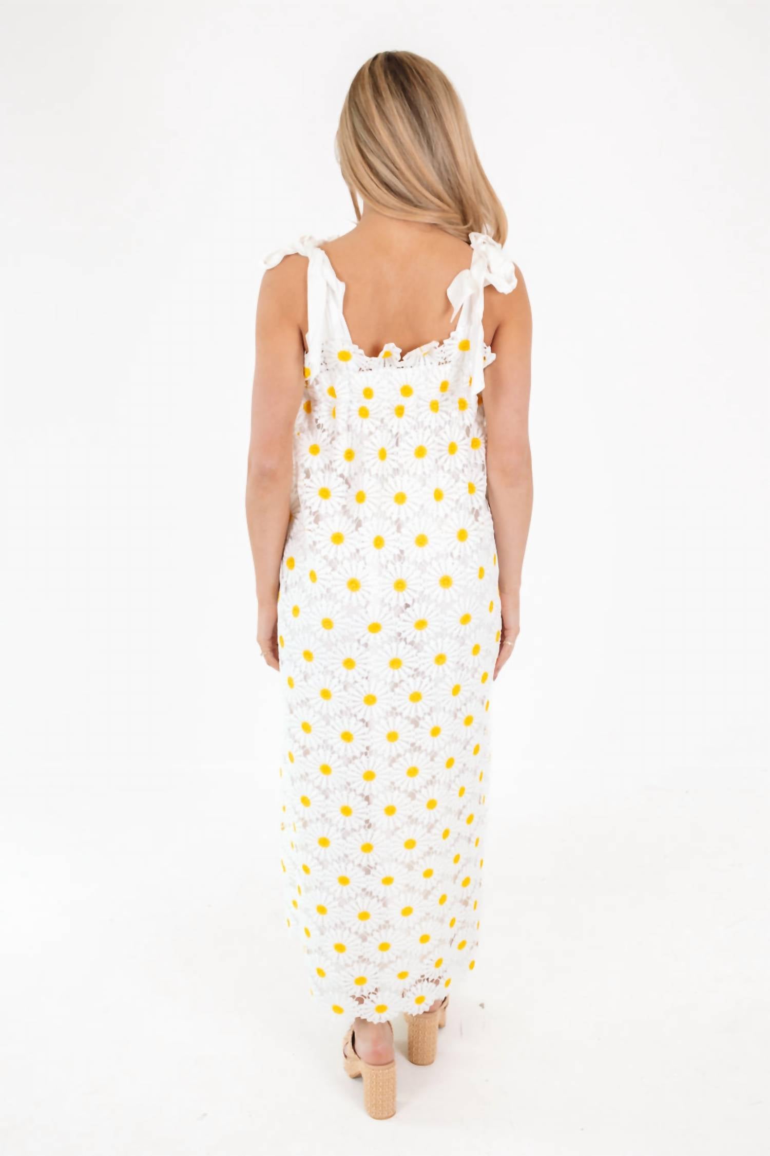 Tie straps. Lace detail. Lined. Model is 5'6" and wearing a size Small. Lace length 52.5" and lining length 48.5" from size Small. Dry clean. Made of Polyester and Rayon.
