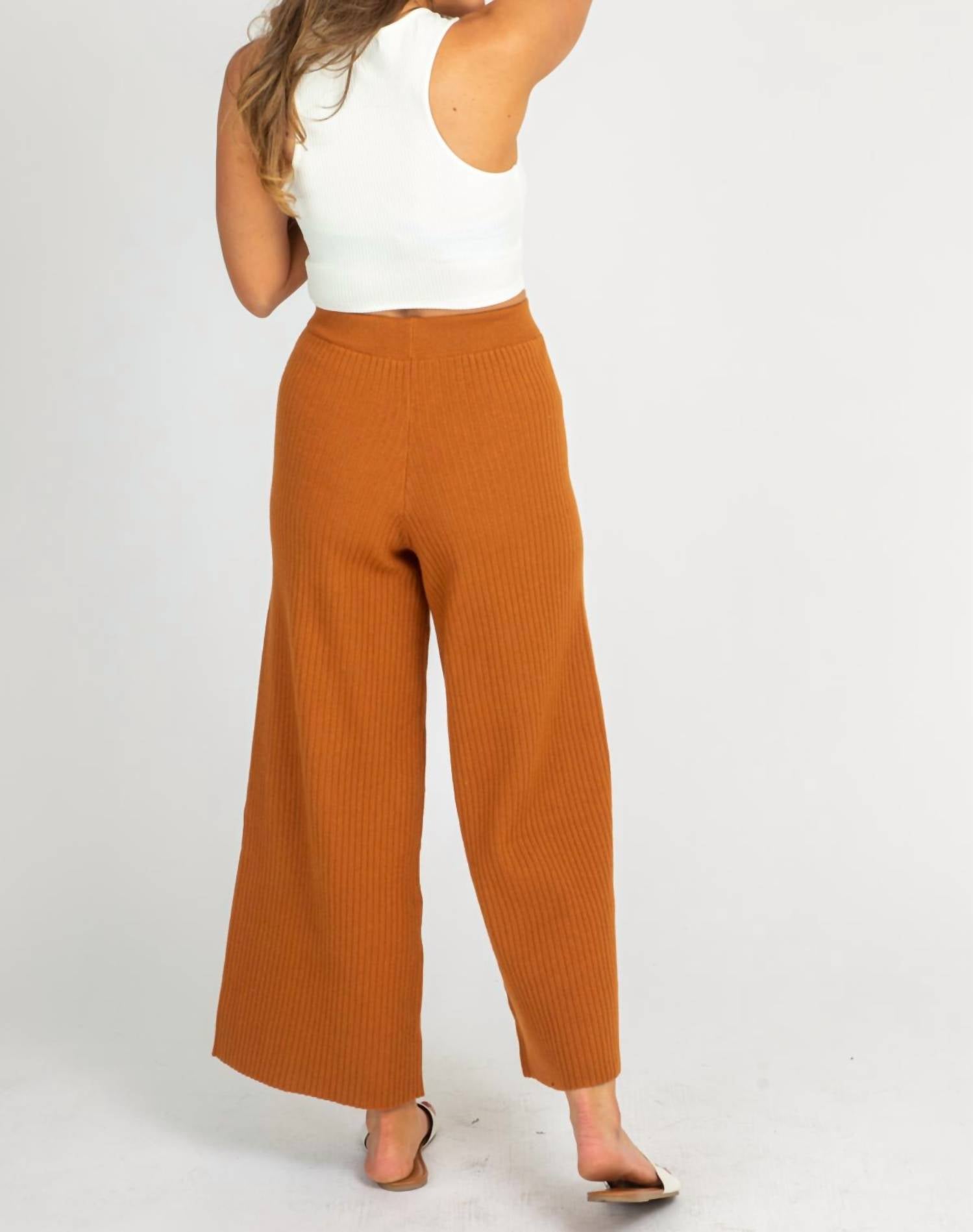 Rib knit flare pants, high rise, drawstring, sweater material. 42% viscose, 30% nylon, 28% polyester. The model is wearing a size small. Height 5'9, Dress size 4-6.