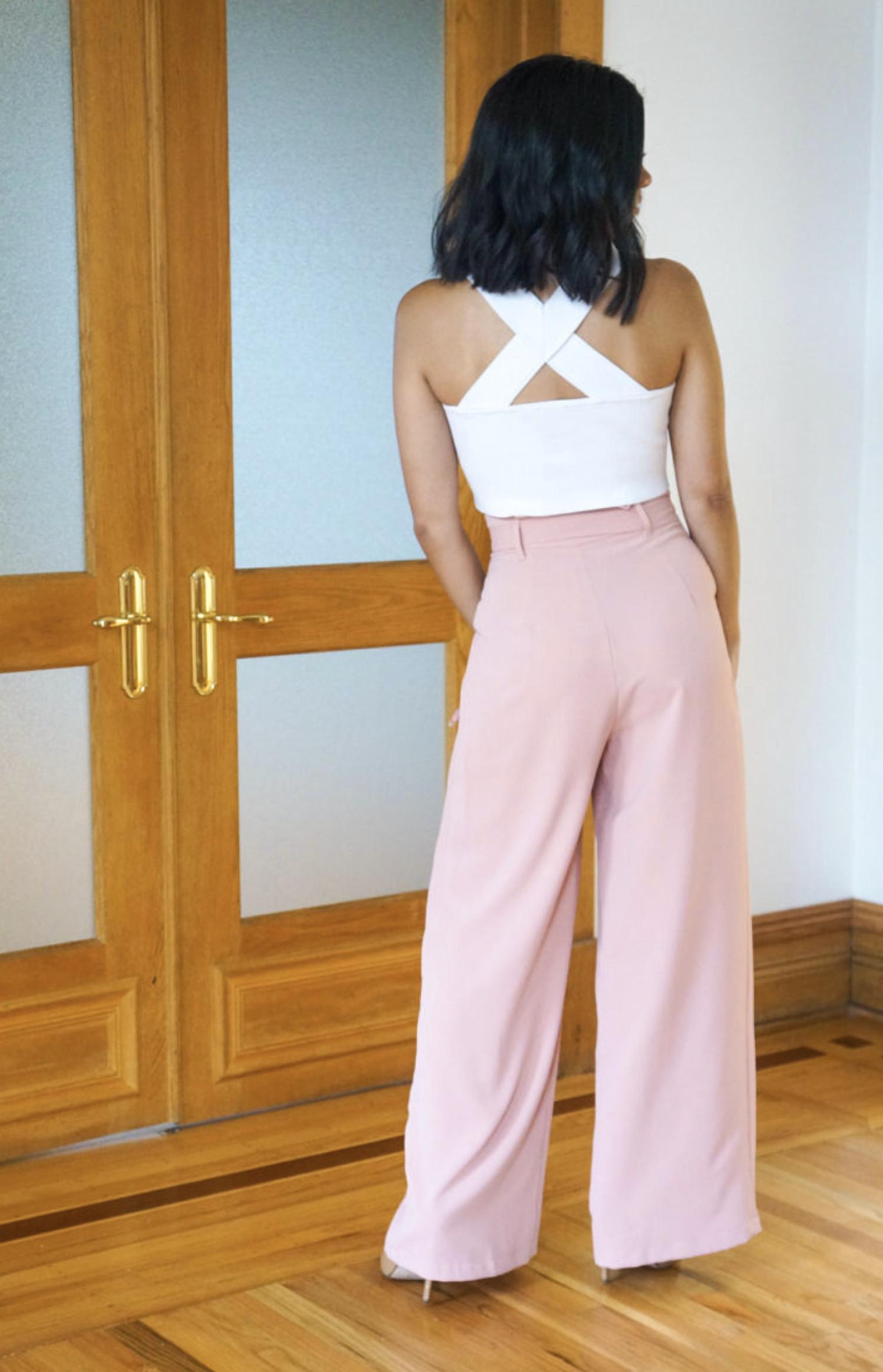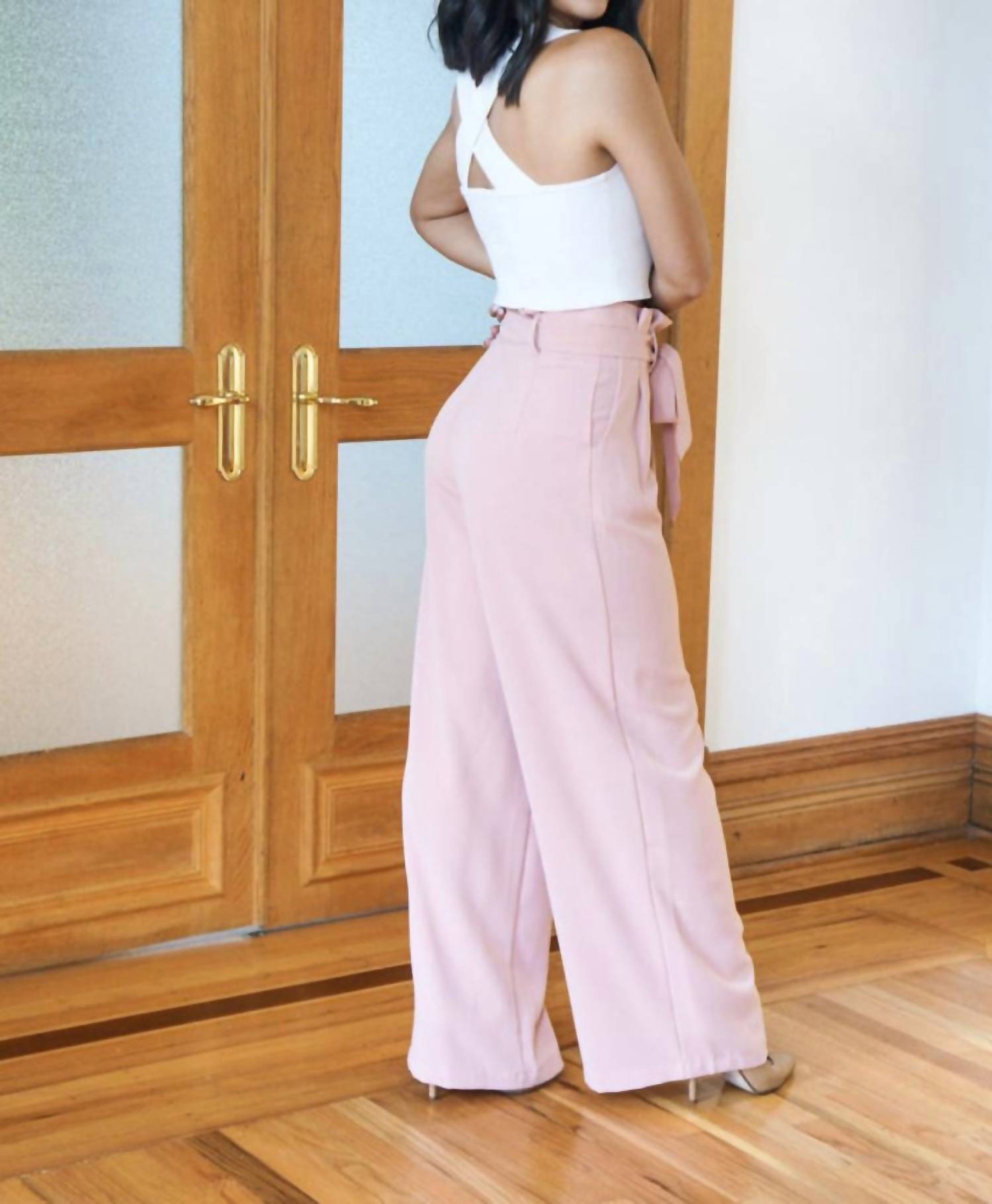 Designed to sit high on the waist and fit relaxed through the wide cropped leg. The blush hue coordinates well with any color and sustains through the Fall! Finished with a fabric waist tie and concealed front zipper closure. High tied waist Front zipper Relaxed fit Scrunched top Wide leg Functional pockets Non Sheer