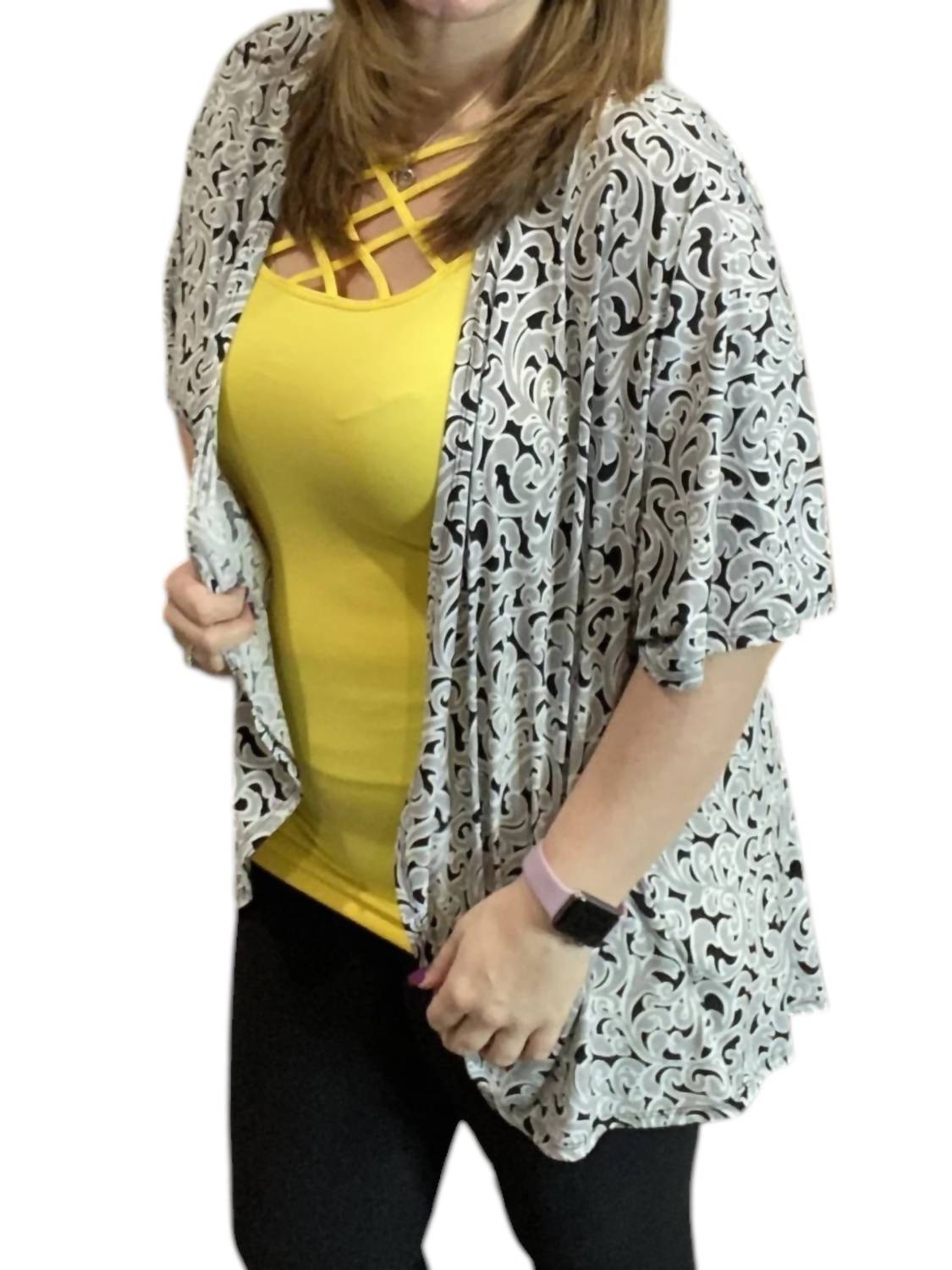 Black, grey, and white swirl cardigan. Open front. Short sleeves. 96% Polyester 4% Spandex.