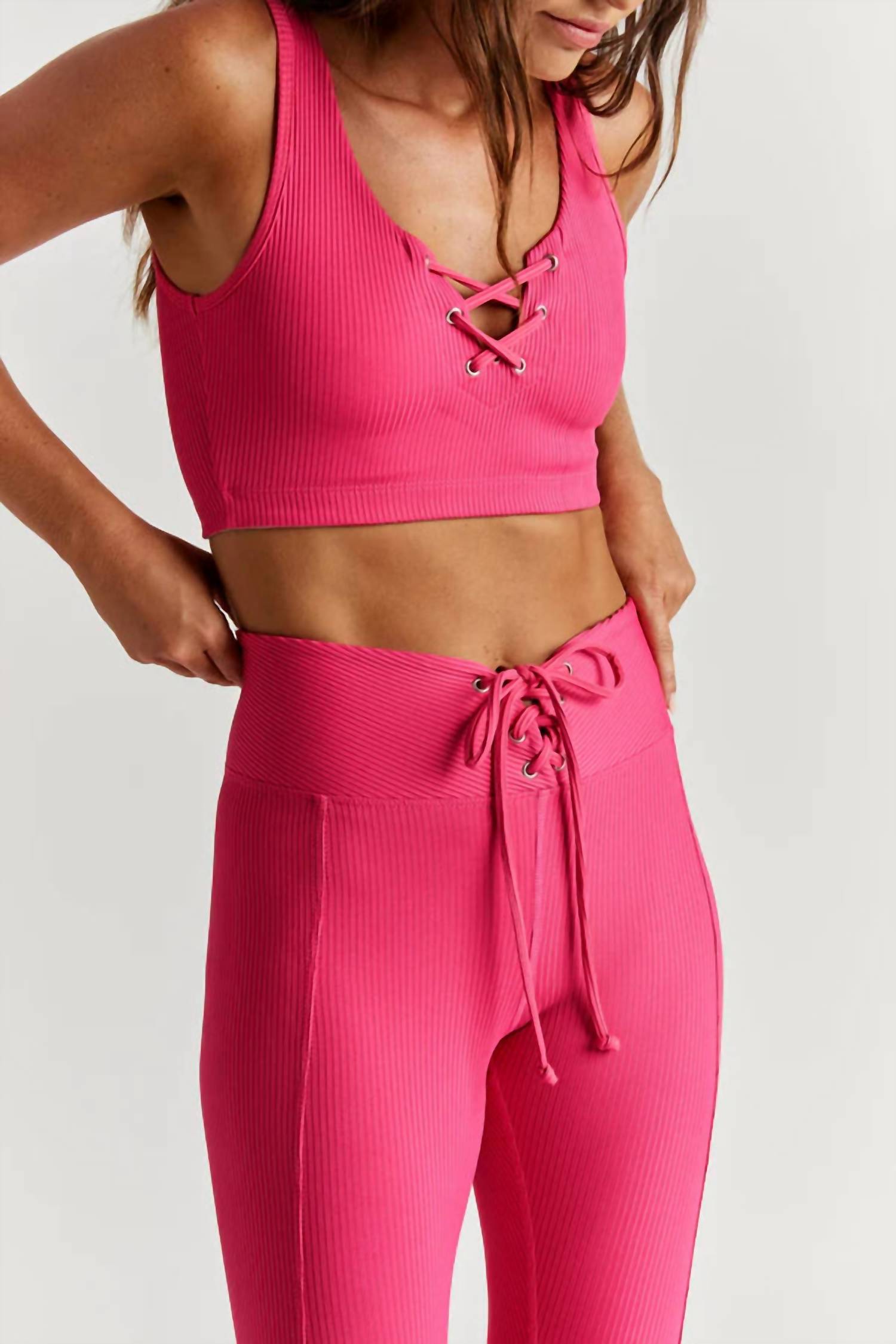 So comfortable you can sleep in it, lounge in it, or work out in it. This magenta sports bra features a lace-up front and a stylish cropped length, crafted from an 85% Nylon, 15% Spandex active rib blend. Made in the USA, it's perfect for medium-impact activities with a lined front and YOS elastic hem for added comfort. Machine wash cold and lay flat to dry.