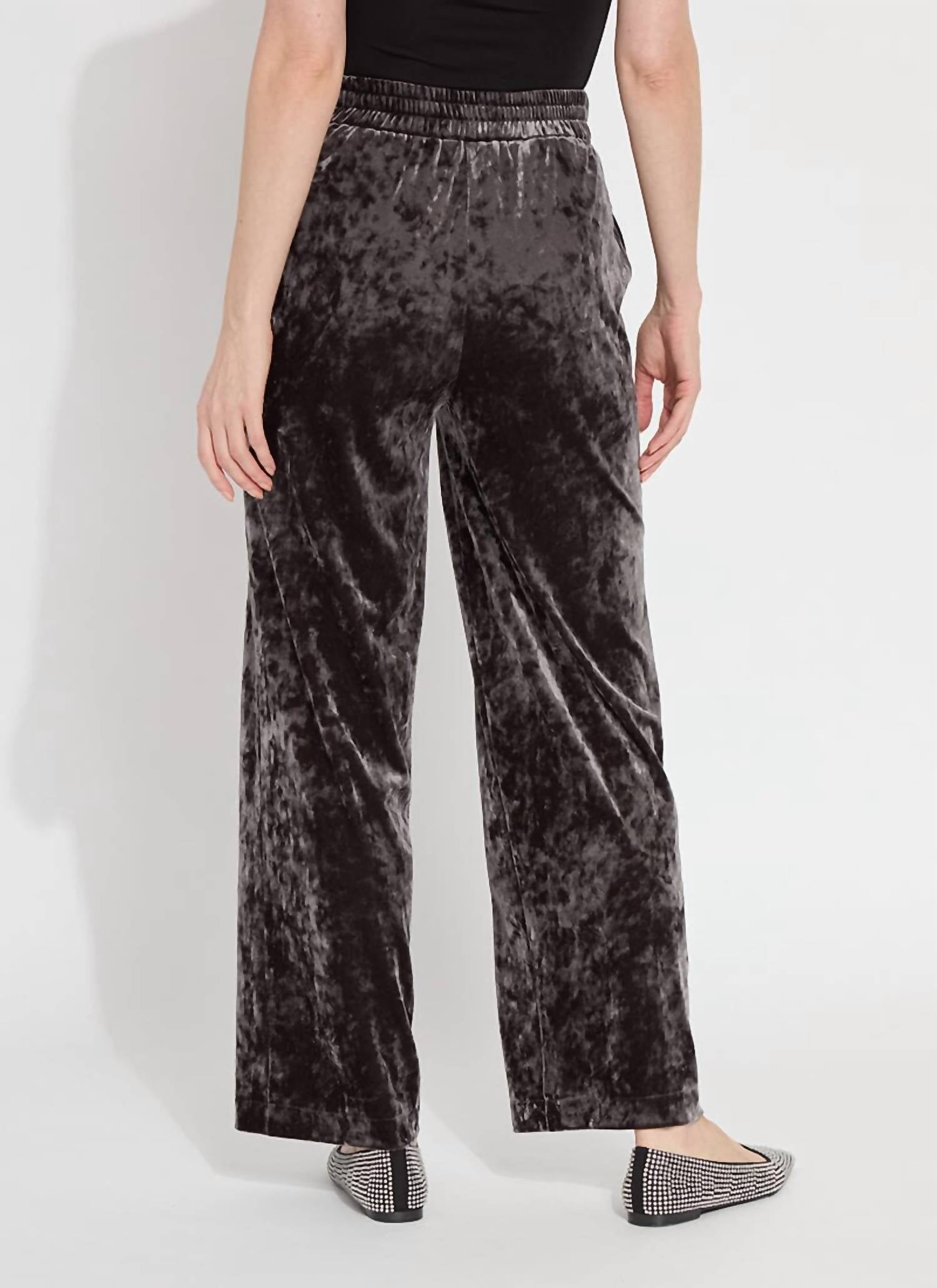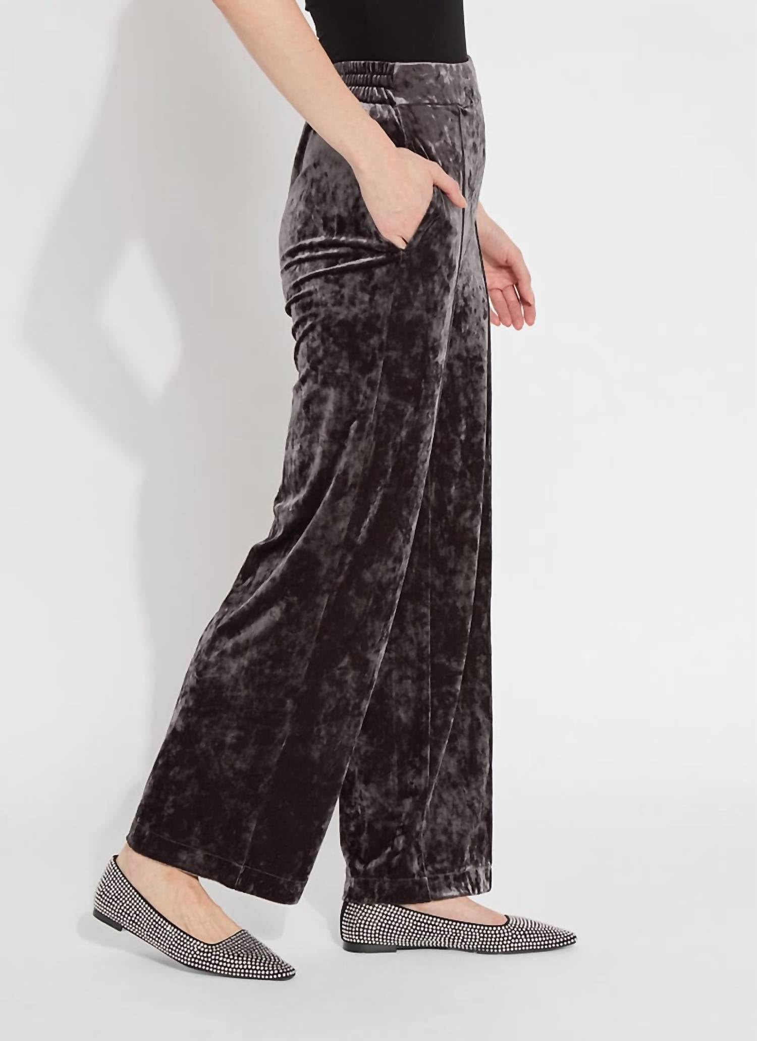 These wide-leg pants in Gray Ash feature a relaxed silhouette with a 30" inseam, skimming the waist and thighs. Crafted from 95% Polyester and 5% Spandex, the 2-way stretch Crushed Stretch Velvet offers sleek softness with a stylish look. With a pull-on closure, side pockets with mesh lining, and an elasticated back waist, these pants are machine washable.