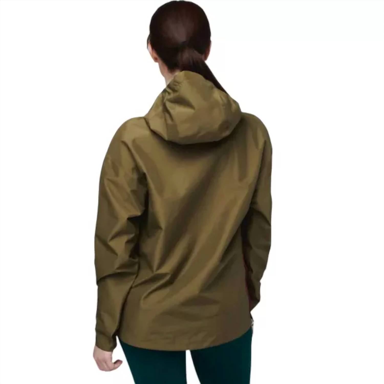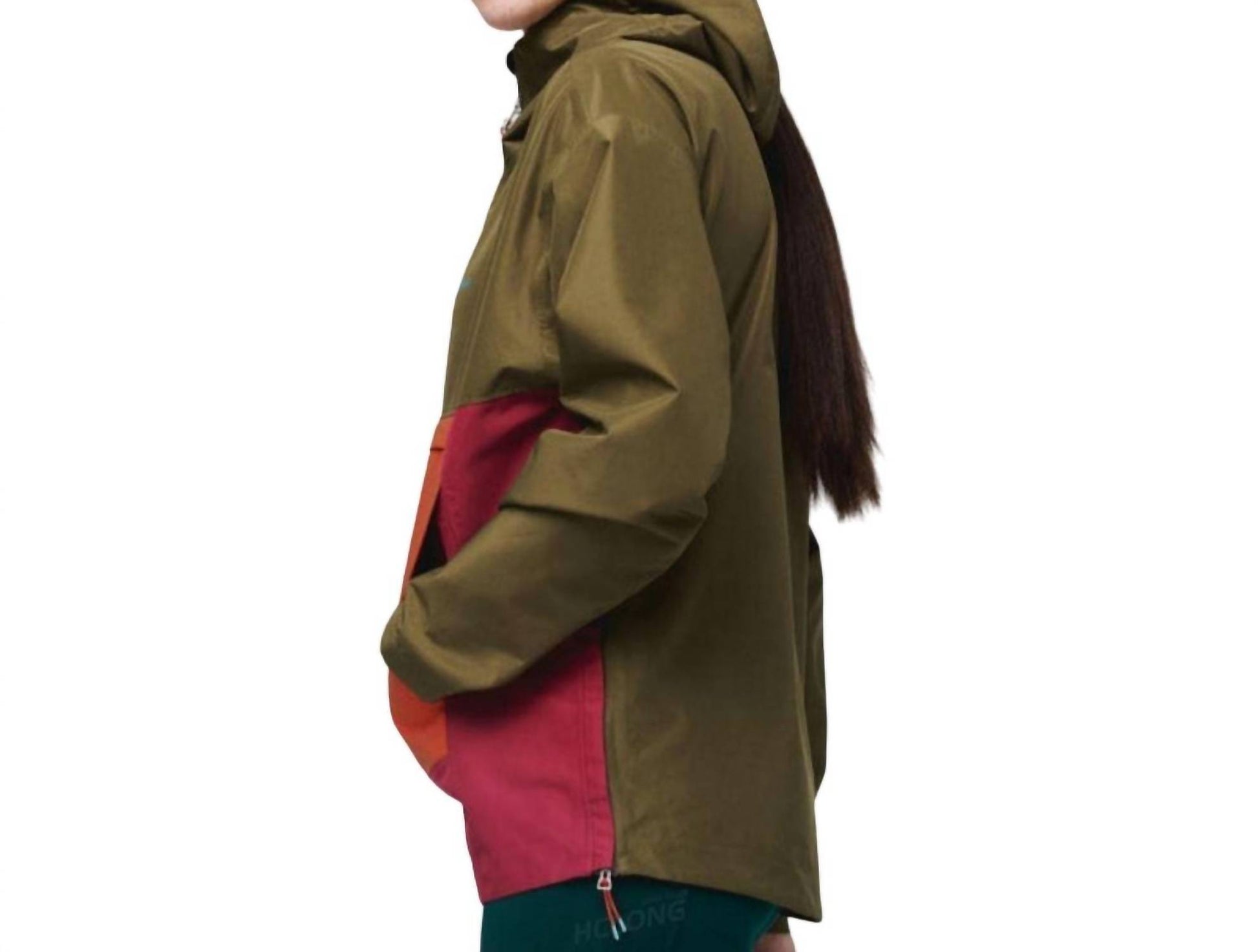 Waterproof fabric & full seam taping keep water out. One-touch hood adjustment. Drop-in zippered pocket. Kangaroo hand pocket. Side zip for easy on/off. Hook-and-loop adjustment cuff. Slight drop tail hem for superior coverage. 2 to 5 Layer construction. 100% Recycled polyester..