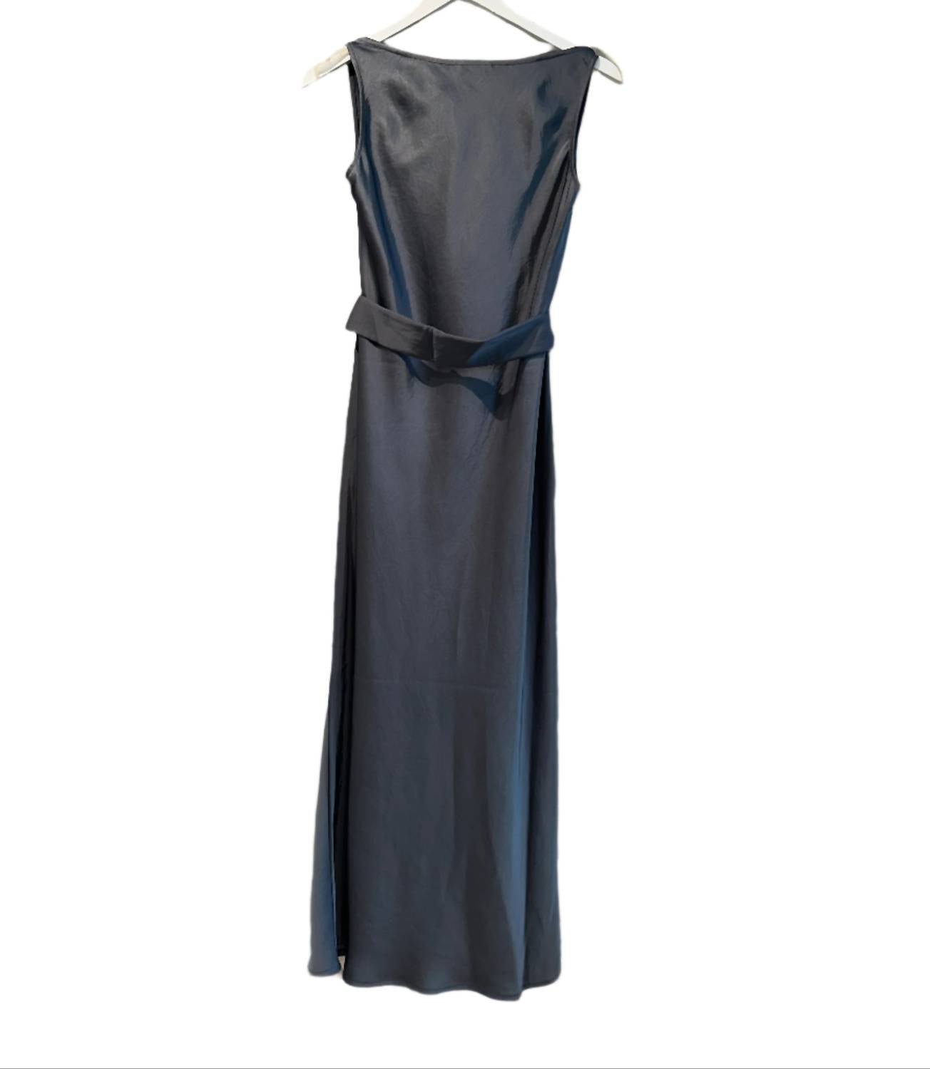 Pair with your favorite sandals for an effortlessly chic look. The Lightweight Satin Belted Dress by LAPOINTE in a sophisticated Gray Blue embodies quiet luxury and effortless elegance. This sleeveless sheath dress features a flattering cowlneck and is crafted from 100% Polyester in a lightweight textured satin. The bias cut ensures a true-to-size fit, cinched at the waist with a coordinating self-belt showcasing DTM enamel hardware. This elegant piece is ideal for summer evening events or Mother's Day celebrations, requiring dry clean only care.