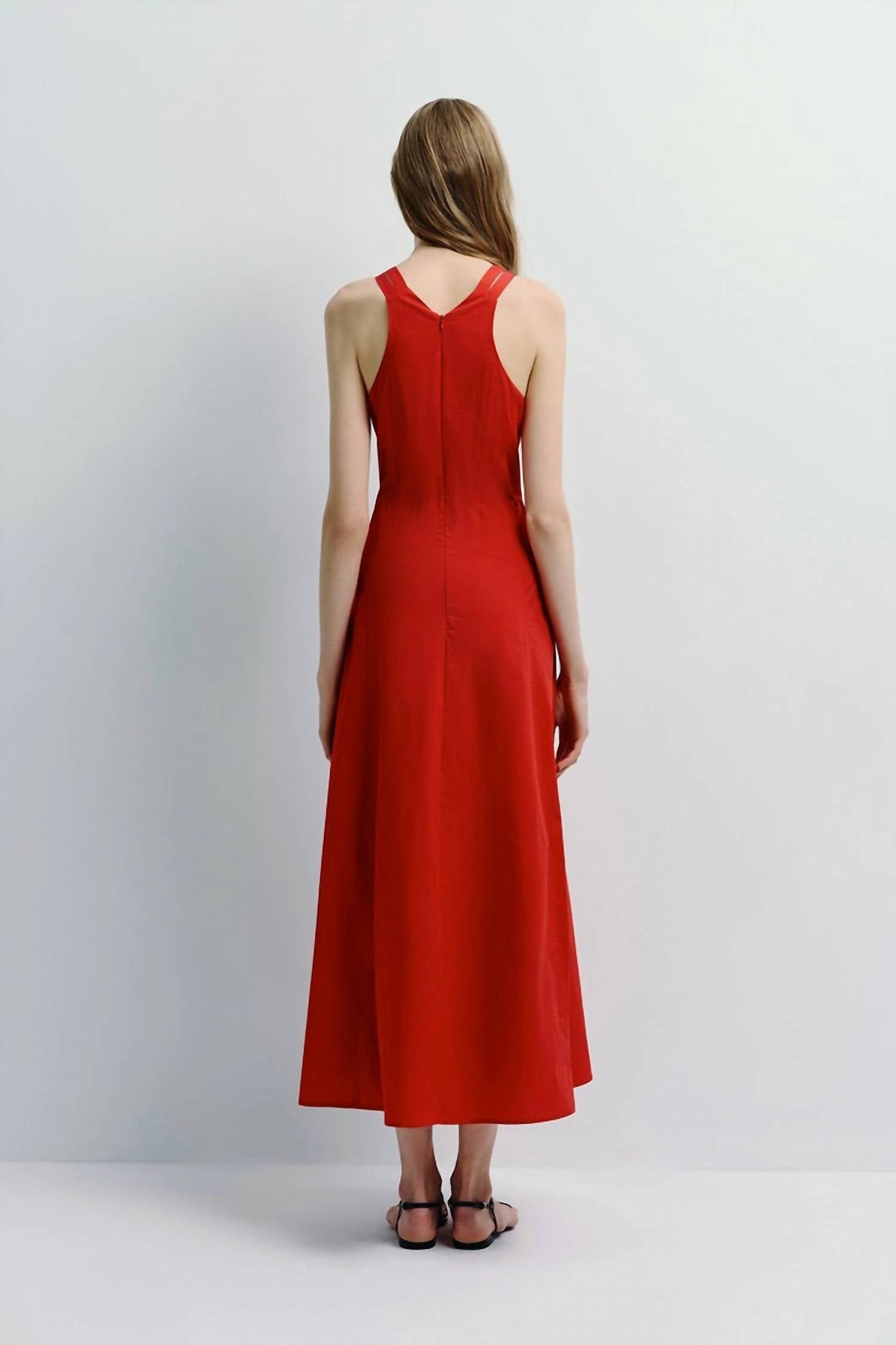 Who doesn't love a good maxi dress? This one you'll be reaching for season after season. Introducing the Delfina Dress by Rue Sophie, crafted from 100% sustainable cotton for a stylish and eco-friendly choice. This red, solid-hued maxi dress features a sleeveless A-line silhouette with a high crewneck and a modern slit strap detail. The dress is designed with a slightly cropped silhouette and includes a convenient zip closure for easy wear. Perfect for a variety of occasions, this dress promises both comfort and a timeless look.