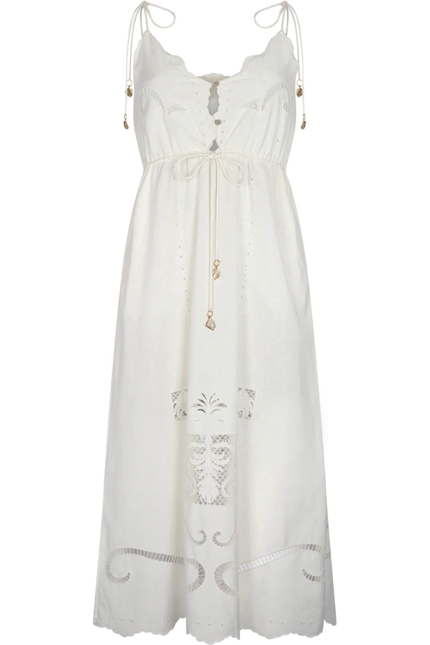 The perfect length dress does exist. Introducing the Opera Dress by Carolina K, an elegant ivory piece perfect for any occasion. This midi-length dress features a V-neckline with spaghetti straps and charming knotted shoulder details. The embroidered cutout detailing adds a touch of sophistication, complemented by practical side pockets. Made in India, this dress boasts a composition of 88% Organic Cotton and 12% Flax, with a convenient back zip closure. Care instructions suggest dry cleaning or hand washing cold, and it should be laid flat to dry.