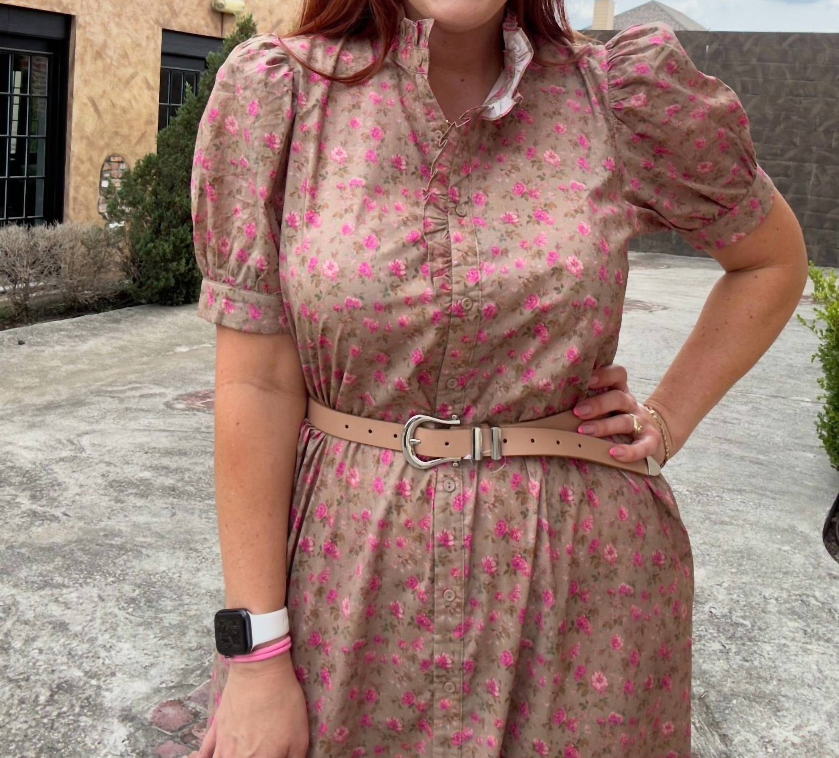 The perfect length dress does exist. Introducing the Blissful Midi Dress by Entro, a chic addition to your wardrobe in a captivating floral design. This A-line midi dress showcases short puff sleeves and a high collar neckline, beautifully combining style and comfort. Crafted from cotton, it features convenient pockets and a button closure, perfect for vacation moments or Thanksgiving gatherings. Care: Machine wash for easy maintenance.