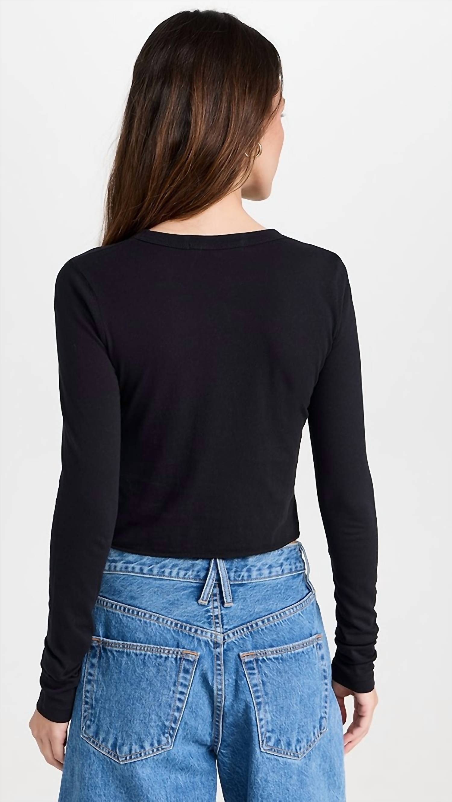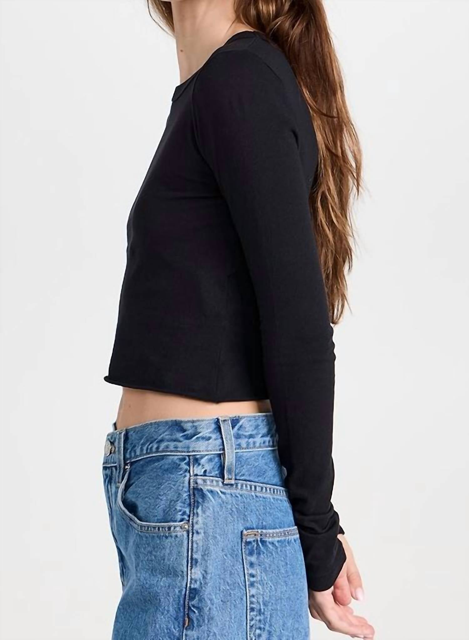 The perfect crop top for those warmer weather days. Elevate your wardrobe with the SLVRLAKE Long Sleeve Baby Tee in Raven, a minimalist choice for a holiday party. Crafted from 100% cotton, this lightweight jersey crop top offers a solid pattern and raw hem, making it effortlessly stylish. Designed with a crewneck and convenient pull-on style, this top perfectly combines comfort and elegance. Care instructions: Machine wash cold.