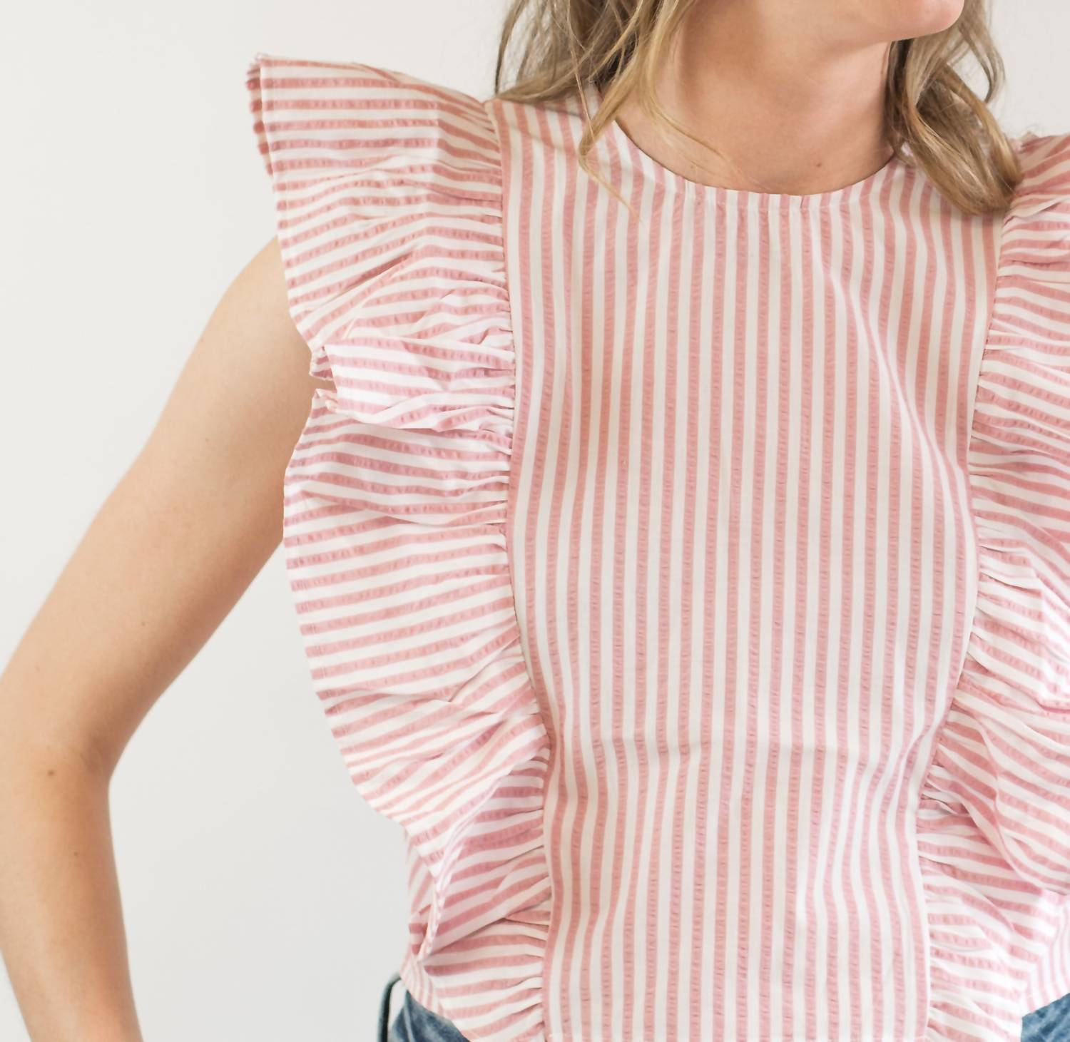 A timeless blouse that will never go out of style. Elevate your spring wardrobe with the Cesar Ruffle Top by DELUC, a chic pink blouse adorned with stripes that exude a lively aesthetic. This sleeveless design features a crew neck and a button closure, creating a casual yet sophisticated look that makes it perfect for vacation-ready ensembles. Pattern: Stripe. A must-have for workwear or leisure activities.