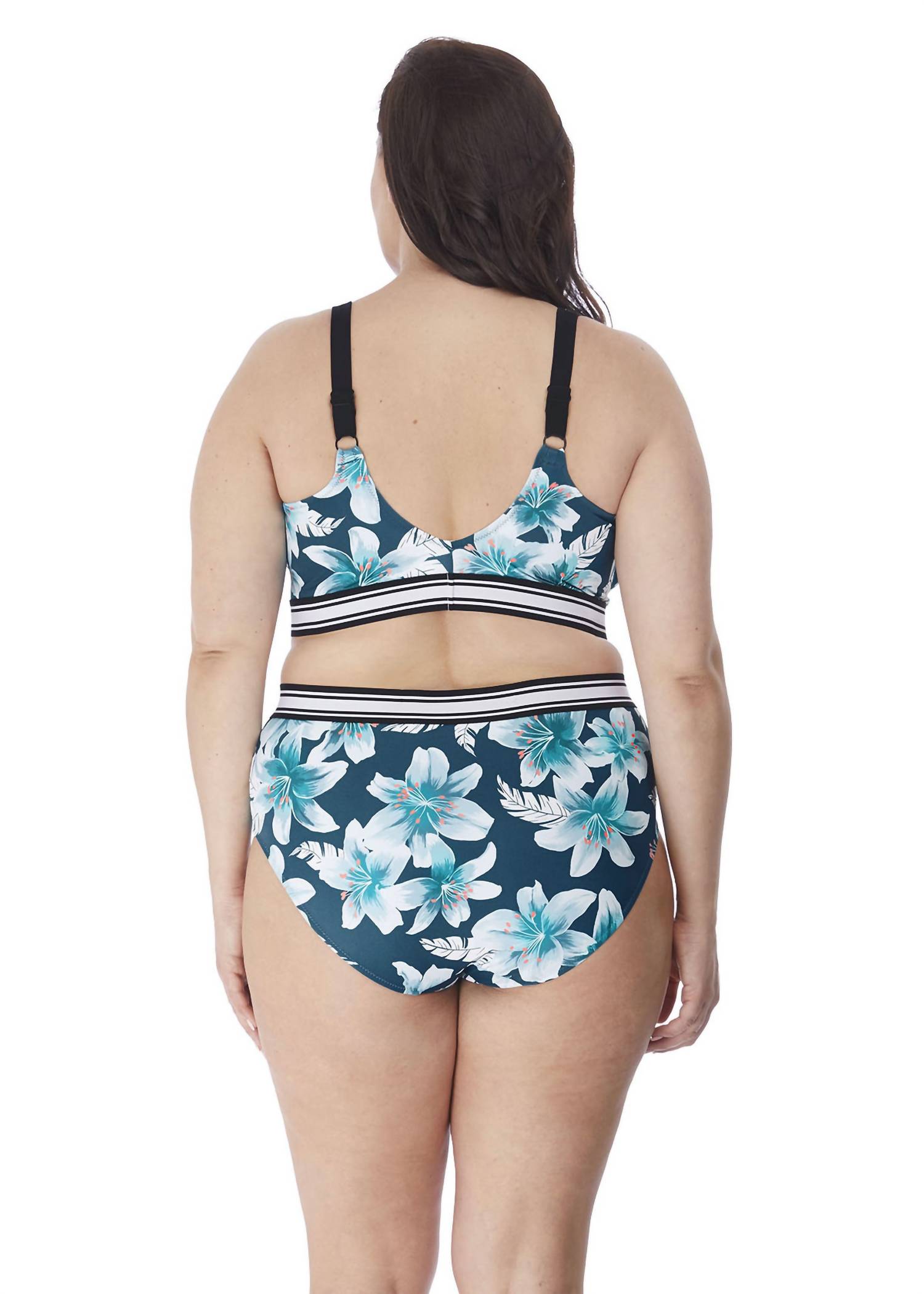 otanical floral print with sweetheart neckline and balcony shape for rounded shape and uplift. Longline style with wide underband elastic. Designed to fit like an Elomi lingerie bra with fully lined cups. Made from lightweight fabric with Xtra Life LYCRA®. Contrasting black bindings at the neck edge and shoulder straps for a sporty style. Hand wash only. 84% Polyamide, 16% Elastane.
