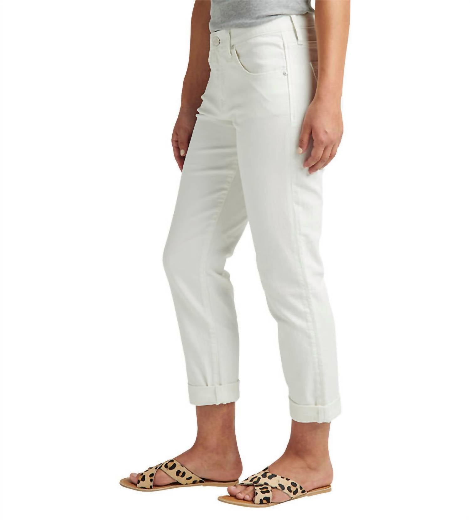 Mid Rise And Slightly Relaxed Fit. Features Interior Elastic At The Waist. This Acts As An Invisible Belt. Smoothing Front Pockets. Slim Leg Girlfriend Jeans. Comfort Stretch Denim. Zip Fly And Button Closure. 13.5'' Leg Opening. 99% Cotton 1% Elastane.