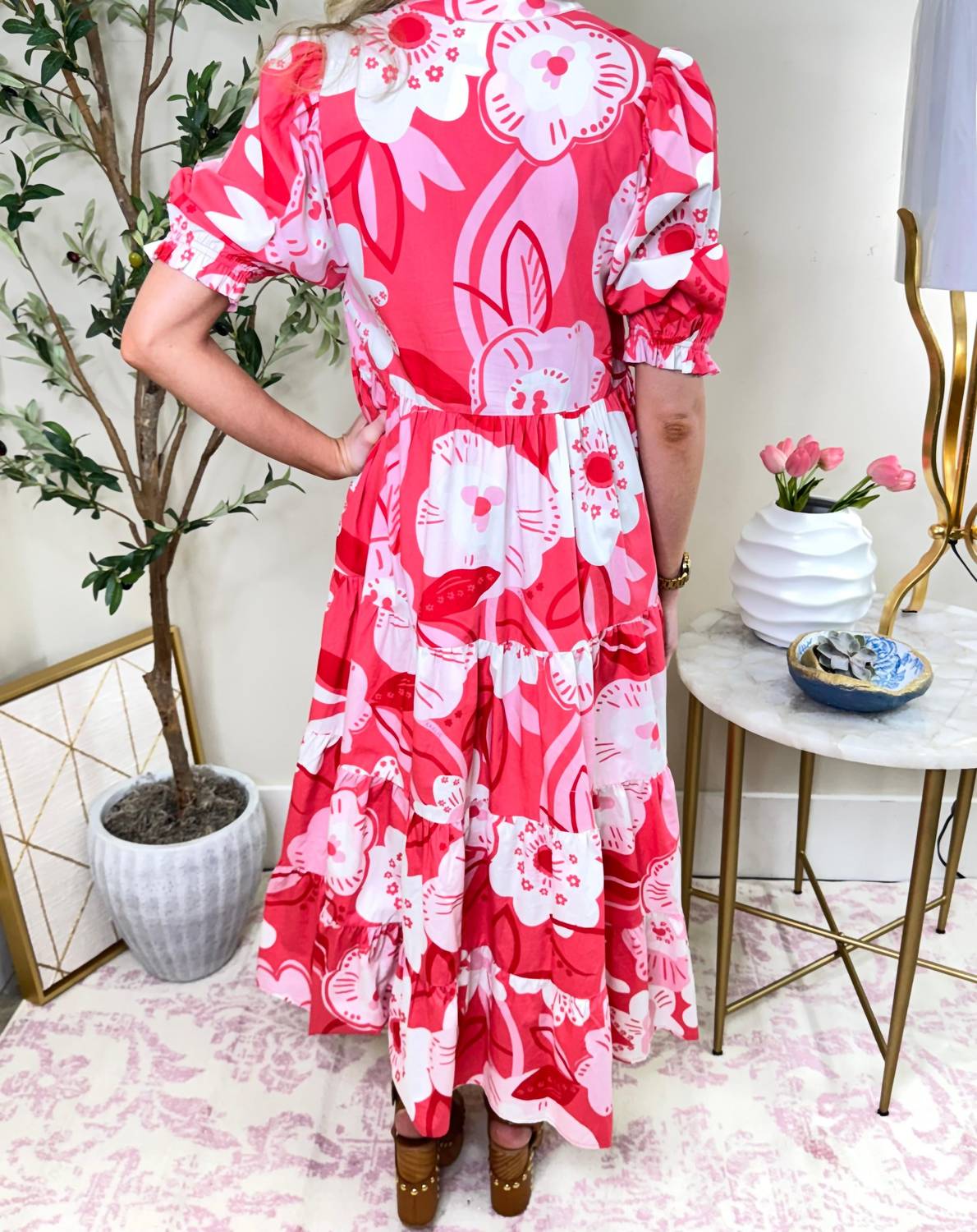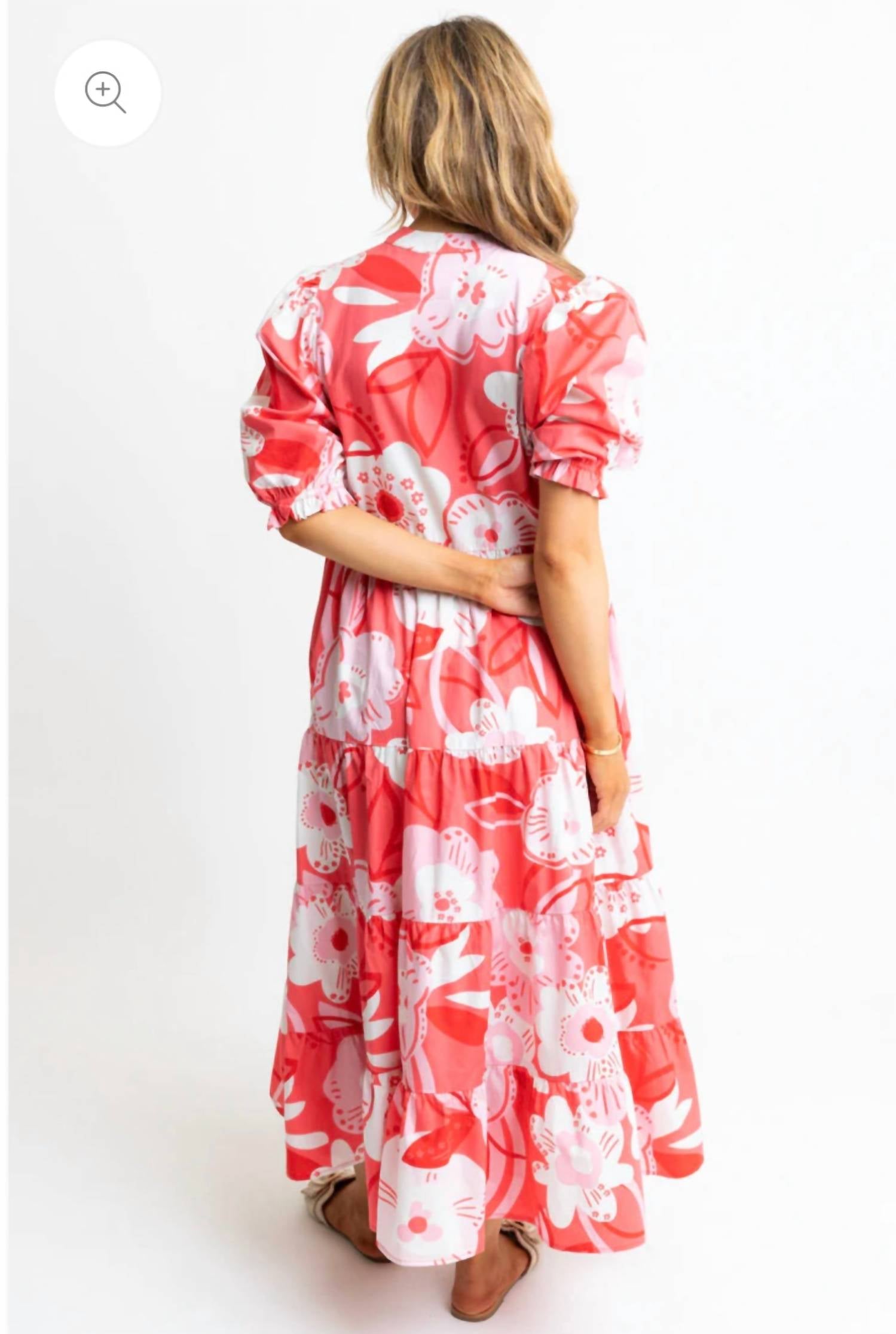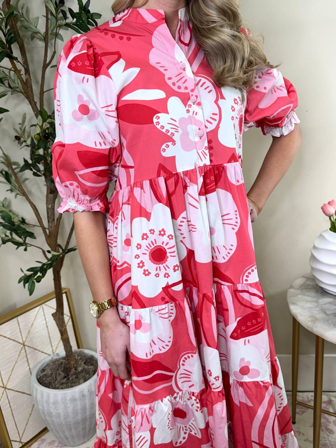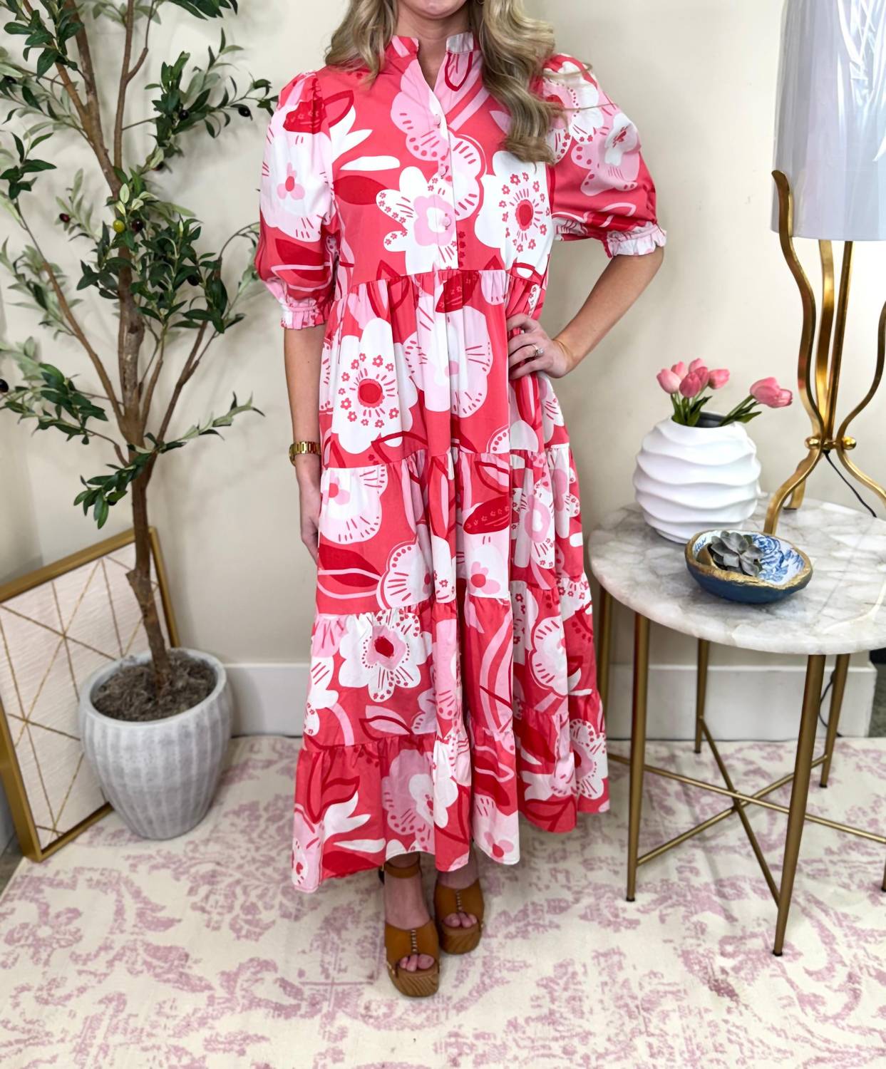 Style this maxi with your favorite statement necklace and sandals for the perfect look. Introducing the Artist Floral Tier Kiki Maxi Dress by Karlie, a striking addition to your summer wardrobe with its playful floral pattern. This women's kaftan silhouette features elbow-length sleeves and a flattering V-neckline. Its vibrant red design is secured with a button closure, making it as practical as it is stylish for a Boho Chic spring outing. Enjoy effortless care with its durable construction, just tumble dry as needed.