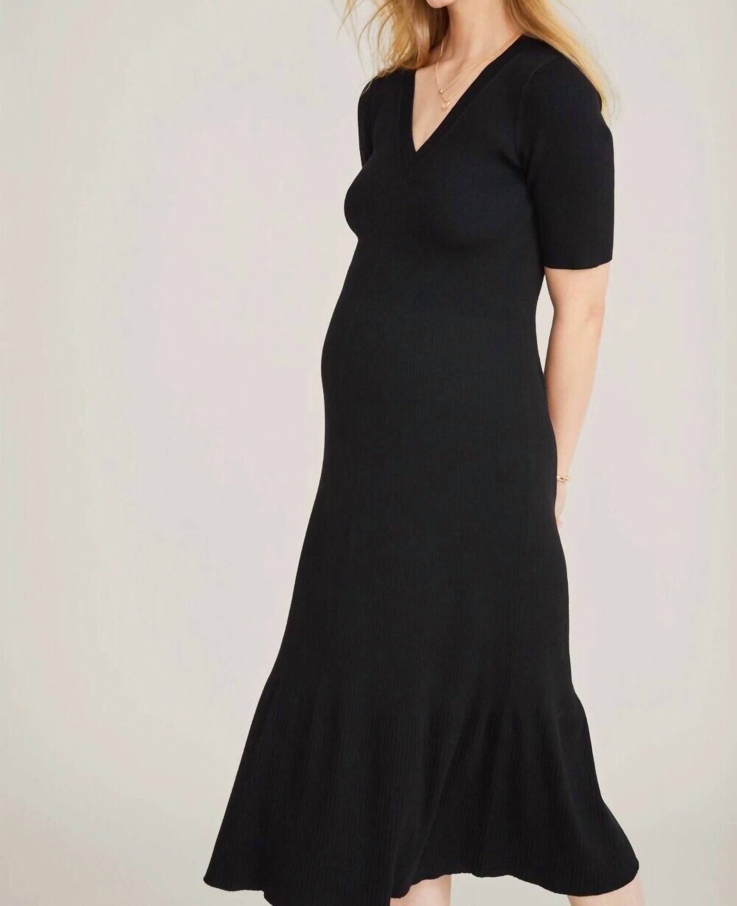 The perfect length dress does exist. Introducing the Vivienne Maternity Dress by Hatch, a chic option for expecting mothers. This maternity dress flaunts a V-neck with short sleeves and a stylish A-line silhouette, composed of an 80% Cotton, 17% Nylon, and 3% Spandex blend. It comes in a versatile midi length, available from 46.5" to 49", and features a comfortable pull-on closure. Care is simple with hand washing recommended, ensuring you stay stylish and comfortable during your pregnancy. Available in a solid black color, it's perfect for any occasion from dinner parties to casual outings.