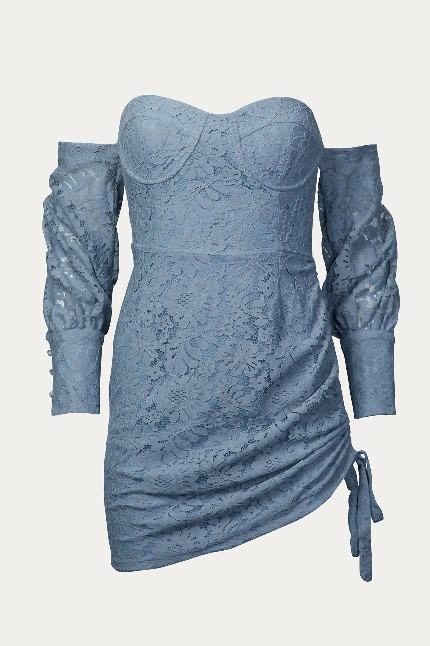 Cut from floral French lace and partially lined with silk, it has a sweetheart neckline with side ruching that creates a figure-flattering fit. The off-shoulder lantern sleeves are unlined - showing peeks of skin through the sheer lace. Adjust the side lace tie to temper the hem. Color: BlueFabrication: Lace, Cotton, SilkCare: Dry cleanStandard Clothing Sizing