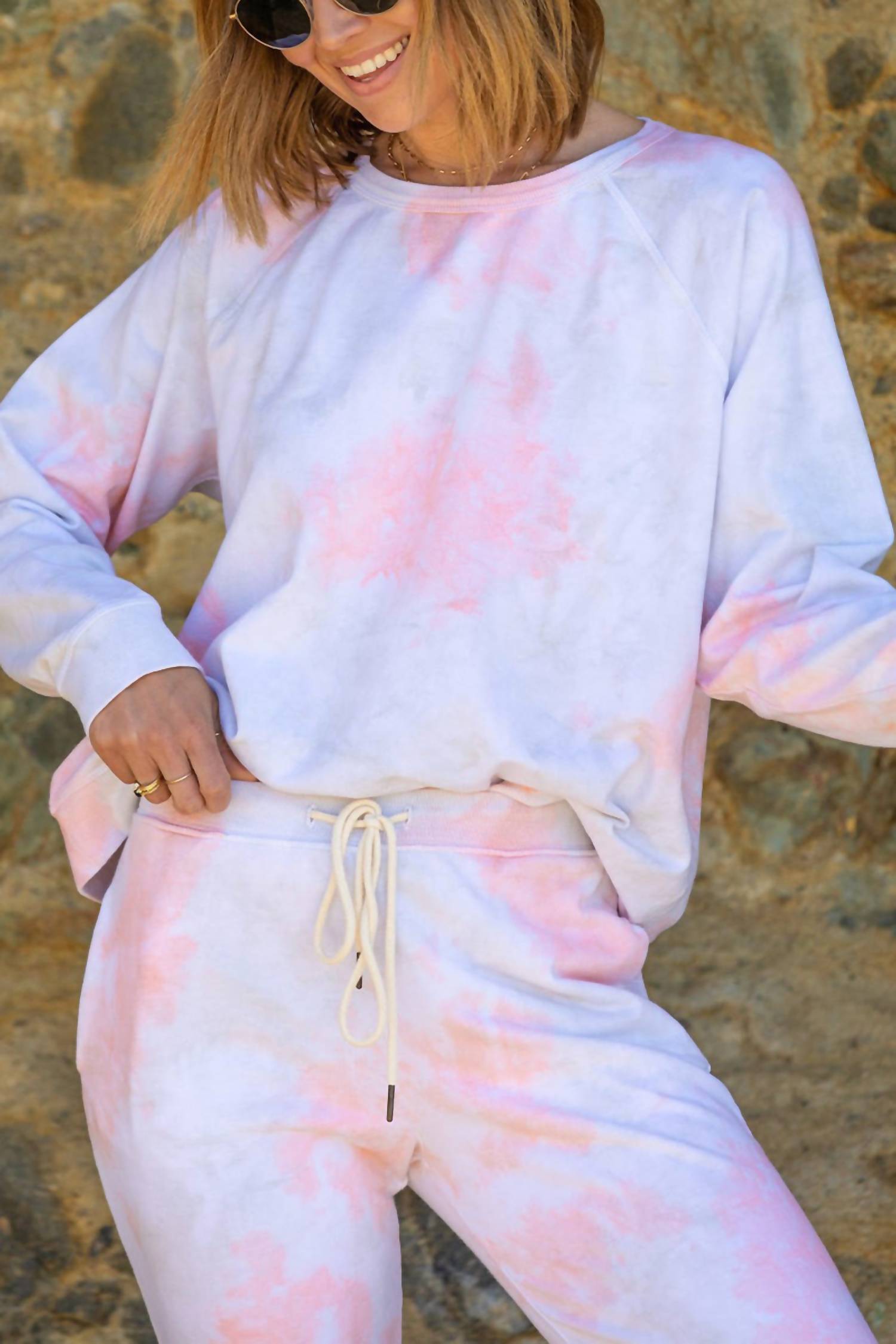 Whether you're running around town or lounging at home, this sweatshirt works for both. Experience laid-back comfort with the Cloud Nine Sweatshirt by LOVESTITCH, featuring a striking butterfly tie-dye wash in apricot. This long-sleeve pullover offers a classic, relaxed fit for easy wear. Crafted from 100% cotton, it boasts a soft French terry material. Closure: Pull-on. Enjoy the option to pair with matching sweats for a complete look.