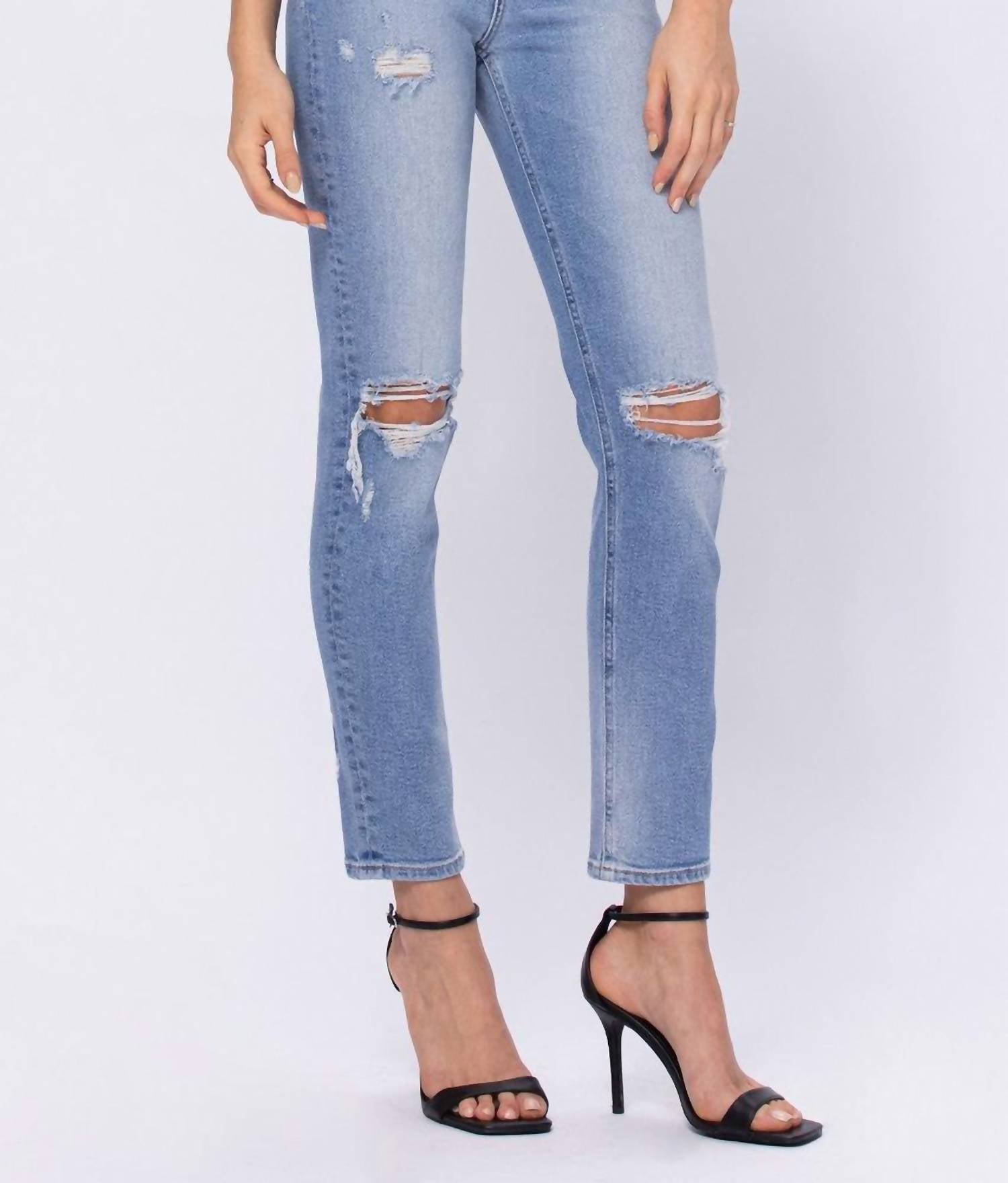 High-waist is here to stay and we especially love this style. Introducing the High-Rise Classic Distressed Mom Jean by HIDDEN, perfect for embracing a 90s fashion vibe. These medium wash jeans feature a high-rise waist and distressing at the knees and thighs, offering a timeless, worn-in look that evolves with wear. Crafted from a cotton blend (85% Cotton, 11.5% Modal, 4.5% T400, 1% Lycra), these jeans ensure a comfortable fit and super stretchy fabric for effortless movement. With a button closure and a straight leg design, they provide a regular fit and are equipped with pockets for practicality. Care instructions suggest machine washing and tumble drying for maintenance. Model is wearing a size 26 with a rise of 11" and an inseam of 29".