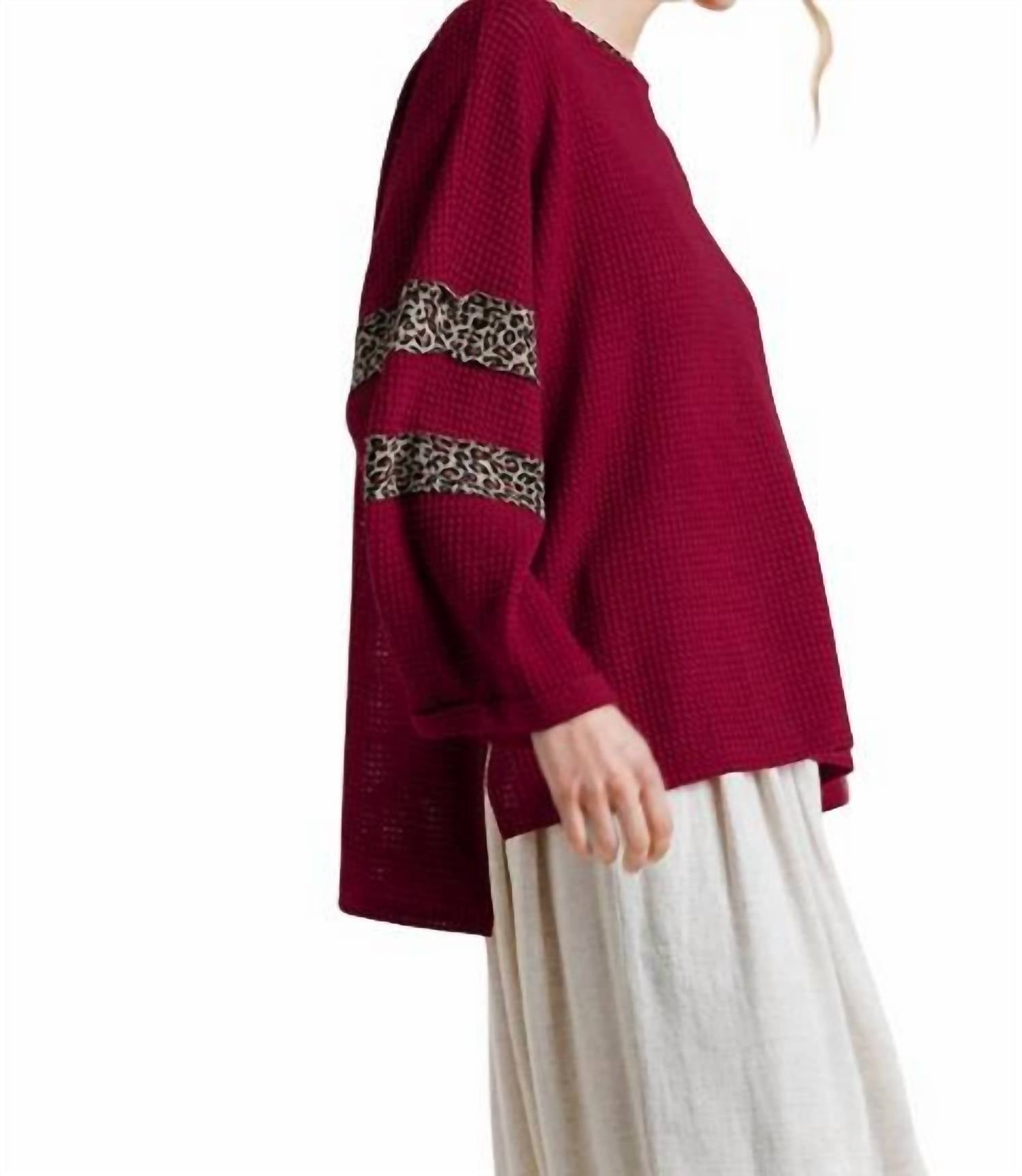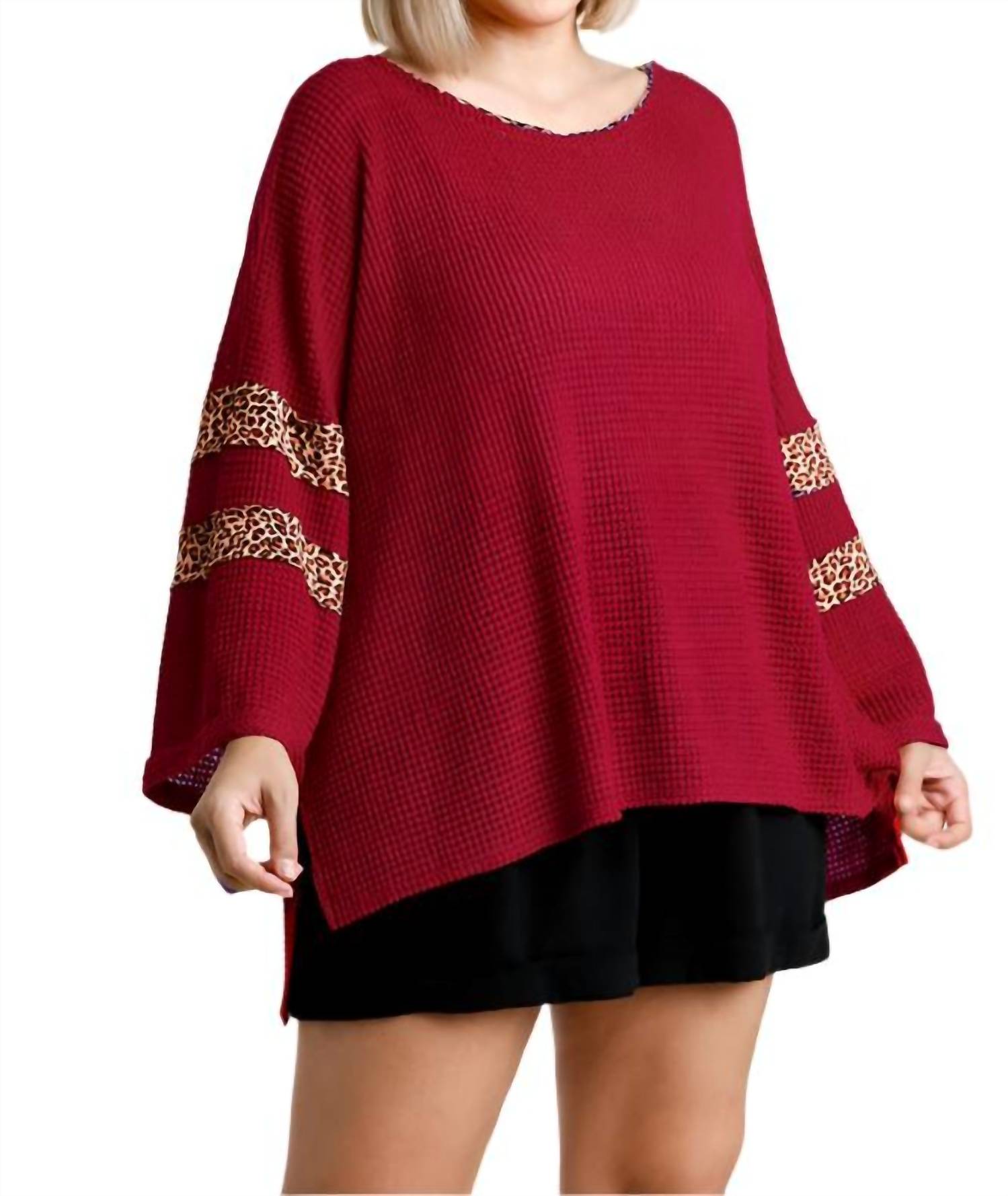 This top features a round neckline, a loose weave waffle knit (semi-sheer), leopard trim, side slits, and a high-low hemline. It has an oversized silhouette. Small Bust 50" Length 26". Medium Bust 52" Length 26". Large Bust 54" Length 26". XL Bust 58" Length 29". 1X Bust 60" Length 29". 2X Bust 62" Length 29". Oversized silhouette. 60% polyester, 34% rayon, 6% spandex. Imported. Hand wash cold.