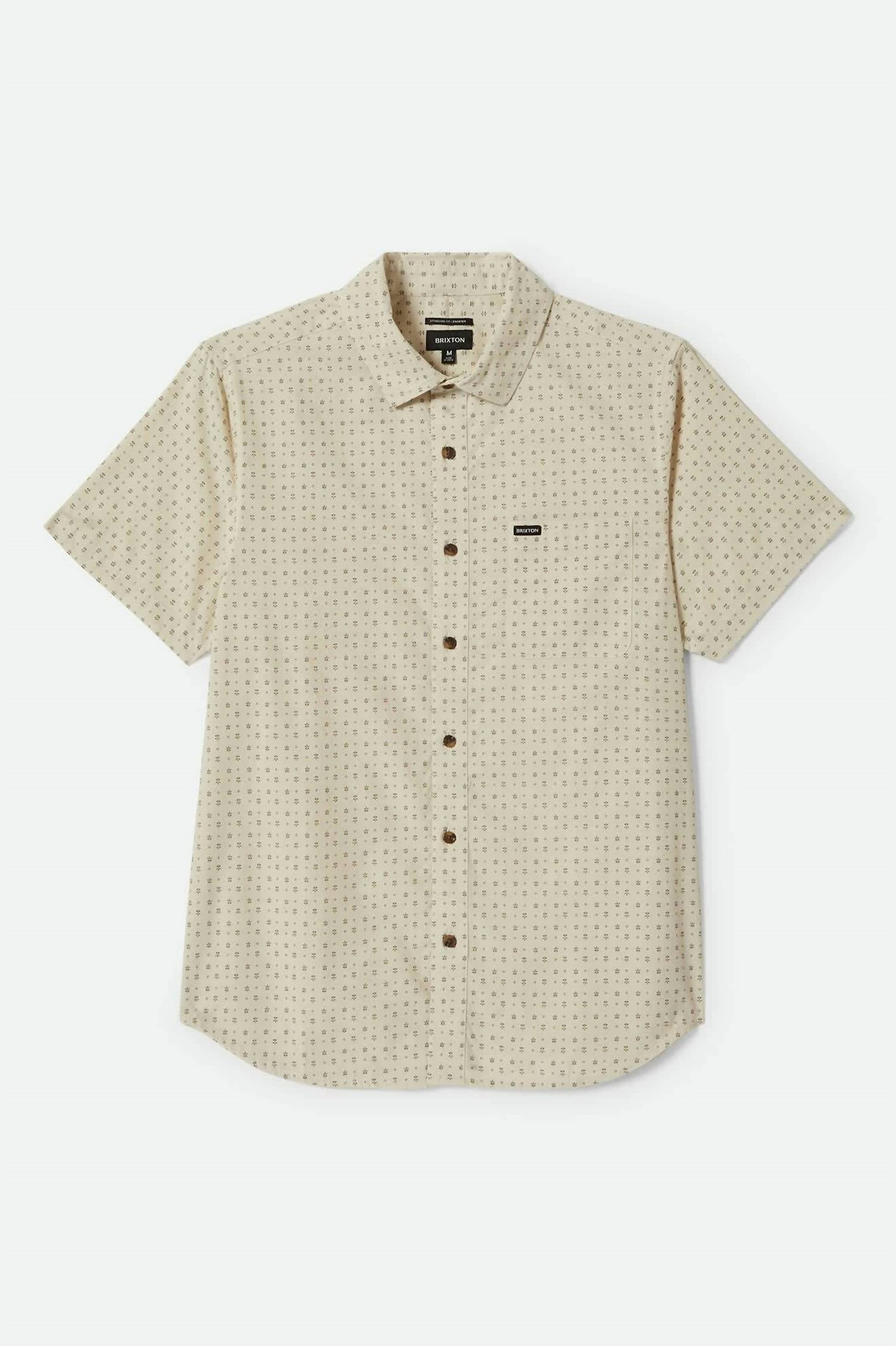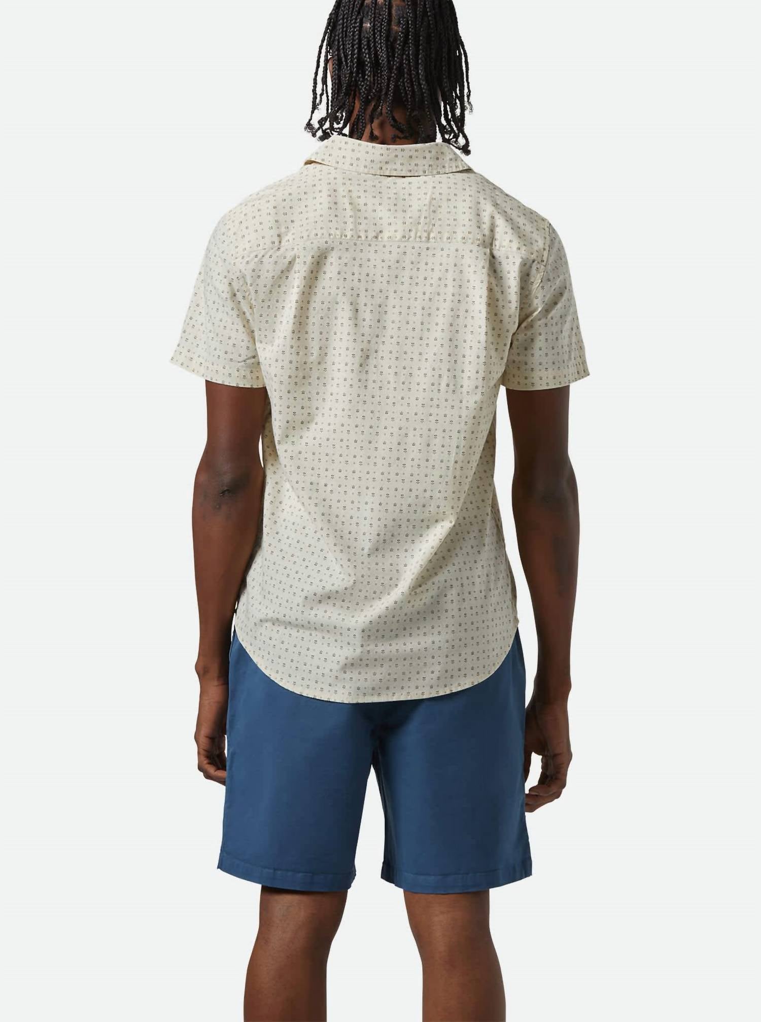 Enhance your wardrobe with the Charter Print Short Sleeve Shirt by Brixton, offering a stylish Off White Micro Floral pattern. Crafted from a breathable tri-blend of 62% Cotton, 36% Polyester, and 2% Elastane, this shirt promises comfort with its enzyme softener wash treatment. It features a convenient left chest pocket and a standard fit with a curved hem. Complete with a button closure, this shirt defines understated style for any casual occasion.