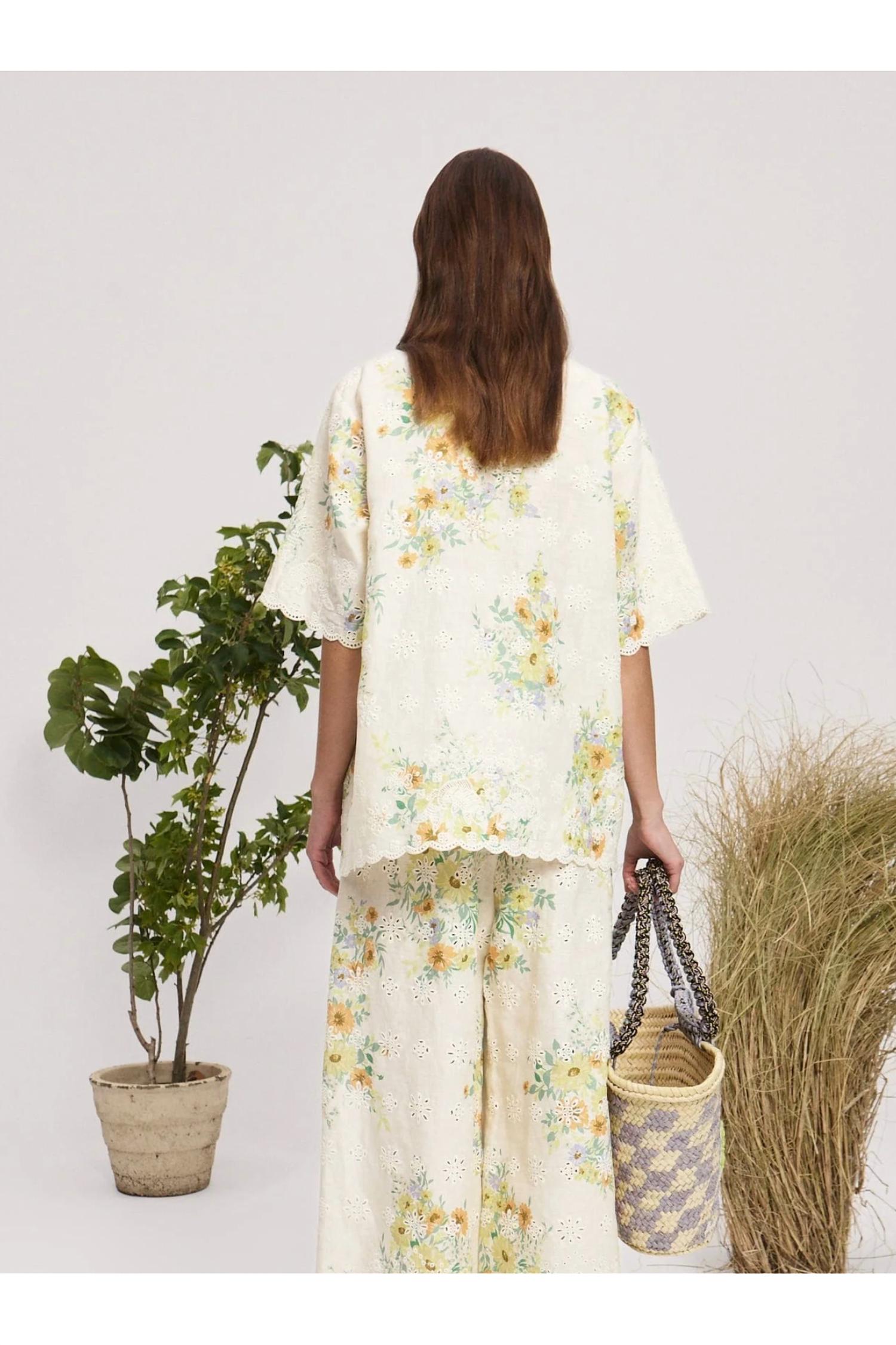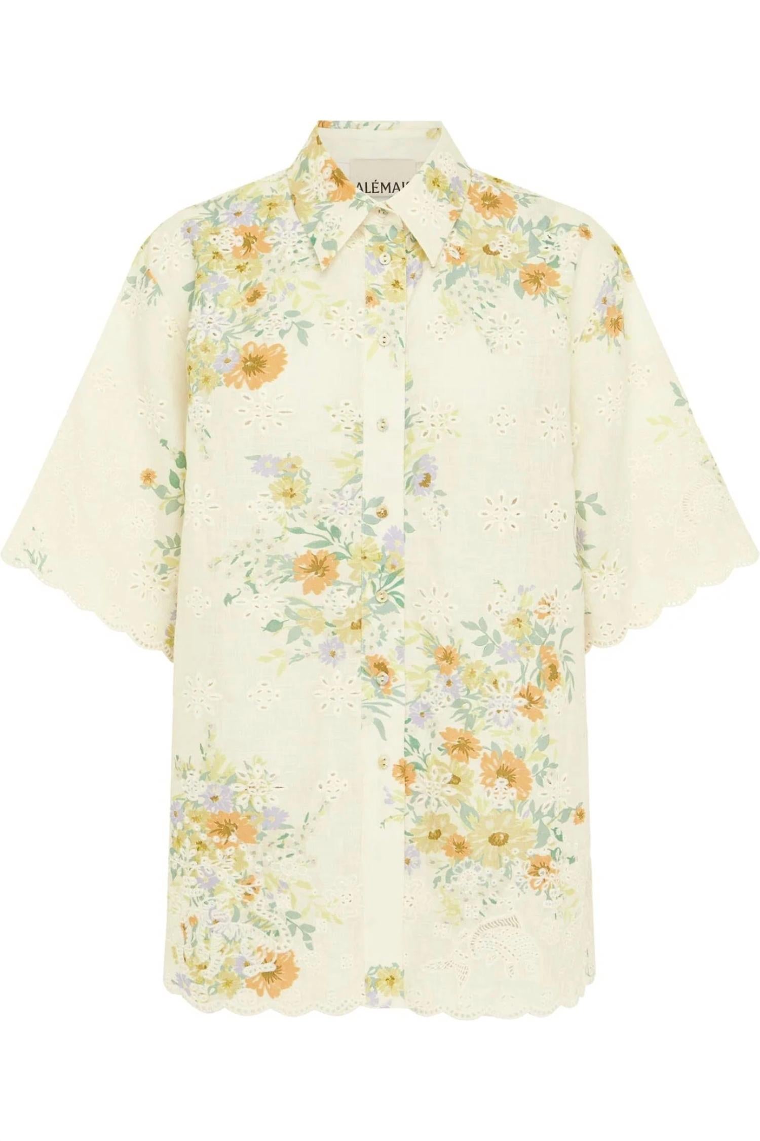 A versatile blouse that works from desk to dinner! The Juliette Shirt by Alemais is the perfect addition to your Boho Chic wardrobe, crafted from 100% European Linen in an elegant cream floral design. This short sleeve blouse features a pointed collar with a stand and a concealed placket with self-covered buttons, ensuring a seamless silhouette. Made for women who appreciate quality and detail, it offers a breezy fit while showcasing the finest craftsmanship. Care for your luxury piece with a gentle hand wash, and enjoy the natural beauty of its linen composition.